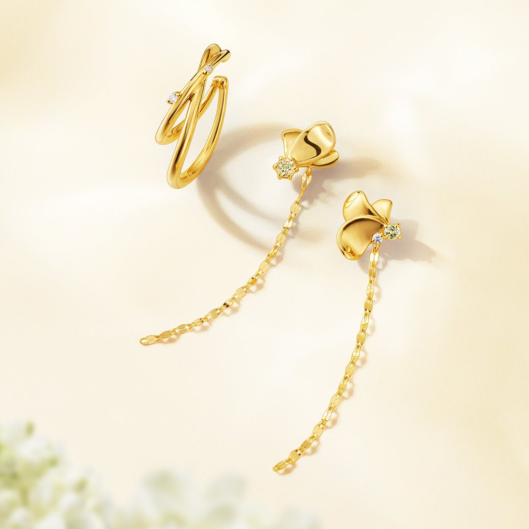 ライラックのくるんとした花びらのラインを表現したシリーズも。4枚の花びらをもつライラックの中で、ごく稀にある5枚の花びらを持つ「ラッキーライラック」をモチーフにしたジュエリーも。小ぶりなライラックの花々の可憐な美しさを表現したピアスとイヤーカフのセットジュエリーや、イヤリング、ブレスレットも登場。鮮やかなクリソプレーズのアクセントでクラスアップしたジュエリーが、春の優しい印象に導きます。