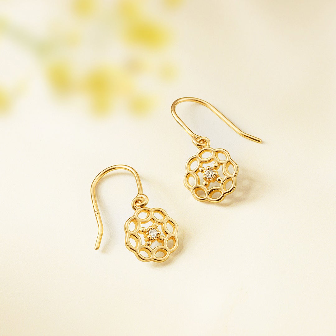 ミモザの花の繊細な表情を地金のミル打ちとストーンのカットで表現した気品あふれるモチーフを身につけて、明るい春の季節の訪れを感じて。