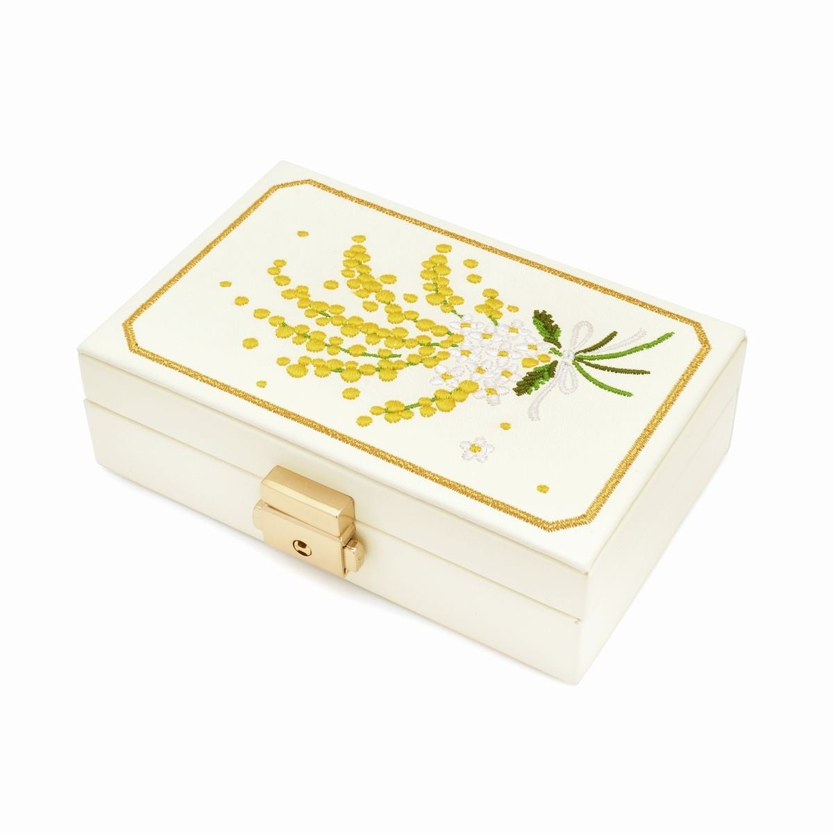 「2024 Spring Collection」をご購入いただいたお客様のジュエリーは、ミモザとライラックの花束の刺繍が施された、春の訪れを感じる可憐なパッケージにお包みしてお渡しいたします。