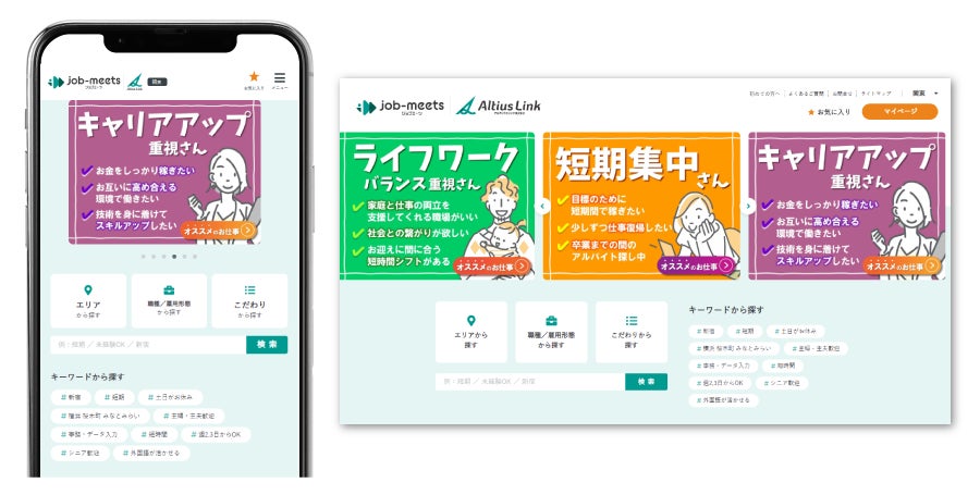 アルティウスリンクは、今後も全国の求職者の皆様に仕事を通じた「出会い」や自分らしく働く環境を提供するとともに、安心してご応募いただける求人サイトとして「job-meets」の機能拡充、サイト改善に取り組んでまいります。