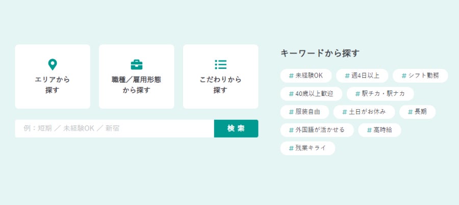 求職者が希望する働き方に合ったお仕事を簡単かつ便利に探せるよう、検索機能をファーストビューに配置。エリア、職種・雇用形態から探せるのはもちろん、「在宅ワーク」「高時給」「週2,3日からOK」「服装自由」「40歳以上歓迎」「未経験OK」といったこだわり条件からの検索や、よく検索されている人気のキーワードからの検索も可能です。これらの条件を掛け合わせた検索もできるので、月間最大1,100件超の求人件数・幅広い業務の中から今の自分にぴったりのお仕事を探すことができます。