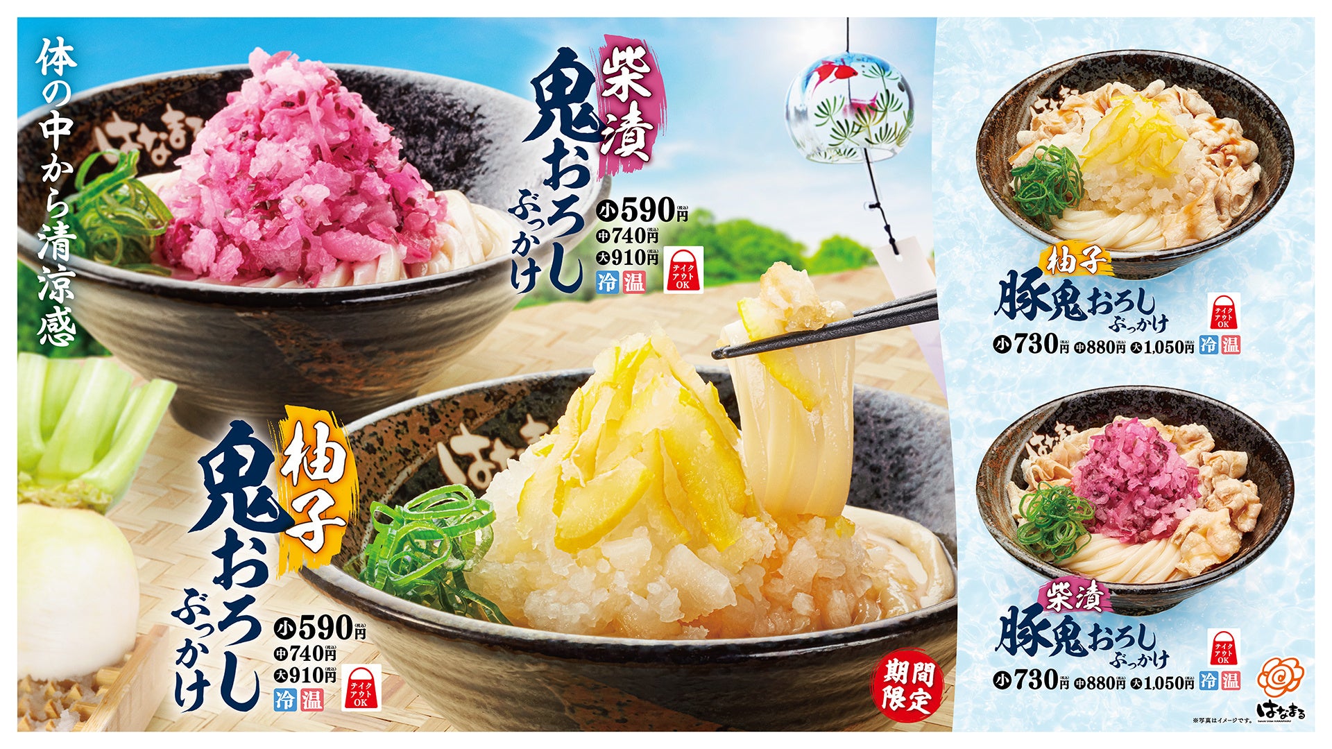 讃岐うどんチェーン「はなまるうどん」を展開する株式会社はなまる(本社:東京都中央区 代表取締役社長:前田良博、以下はなまる)は、2024年6月6日(木)より、全国(※一部店舗除く)のはなまるうどんにて、「柴漬鬼おろしぶっかけ」「柚子鬼おろしぶっかけ」「柴漬豚鬼おろしぶっかけ」「柚子豚鬼おろしぶっかけ」を期間限定発売いたします。