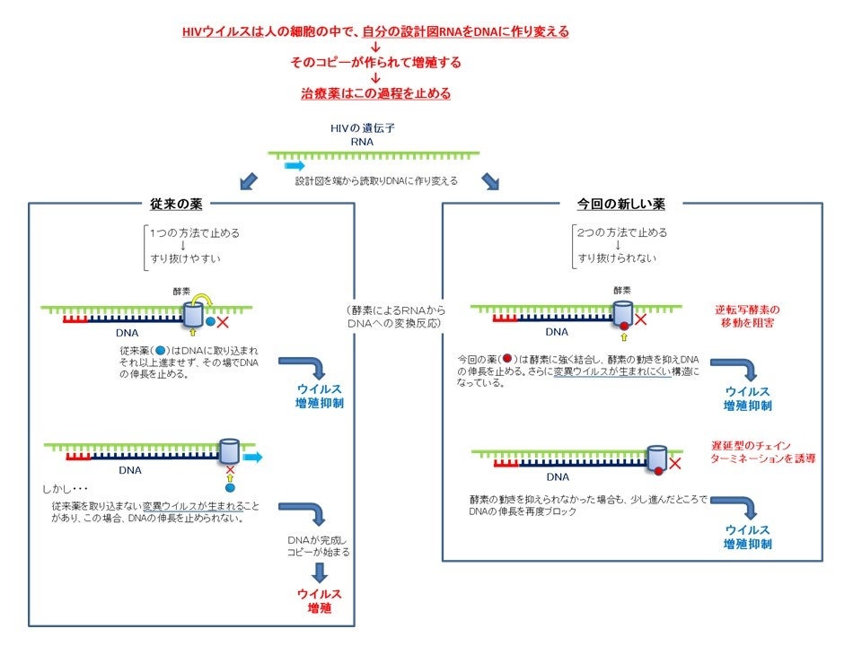 HIVウイルスは、人の細胞の中で、自分の設計図(RNA)をDNAに作り変え、そのDNAをもとにコピーが作られることで増殖していきます。従来の抗HIV薬は、このRNAからDNAへの作り変えの過程において、DNAに取り込まれることでDNAの伸長をその場で止める仕組みを有しております。しかし、ウイルス側の変化(変異)などにより、一部のウイルスには薬が取り込まれず、その作用をすり抜け、伸長が完全には止まらない場合があります。その結果、ウイルスが増殖し、十分な治療効果が得られない症例が課題となっておりました。