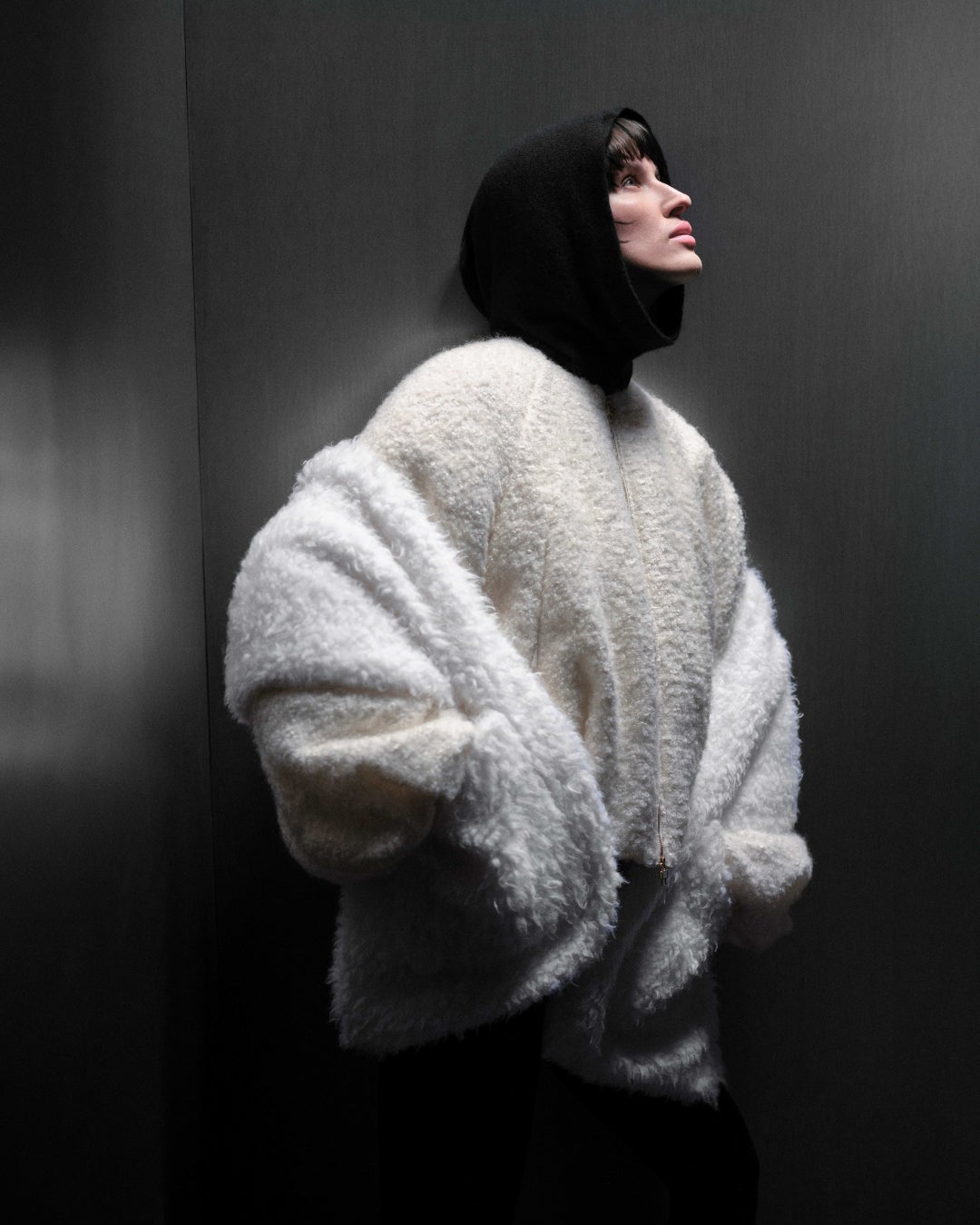コレクションは起毛感のある表情豊かなレース素材や、数種の糸の中に繊細なスパンコール糸を入れて織りあげたことで部分的に奥ゆかしく控えめに光るウールツイード、シルバーとホワイトのジャカード生地を贅沢に用いたダウンジャケット3型をはじめ、ニット・ブラウスなどトータル10型で展開。