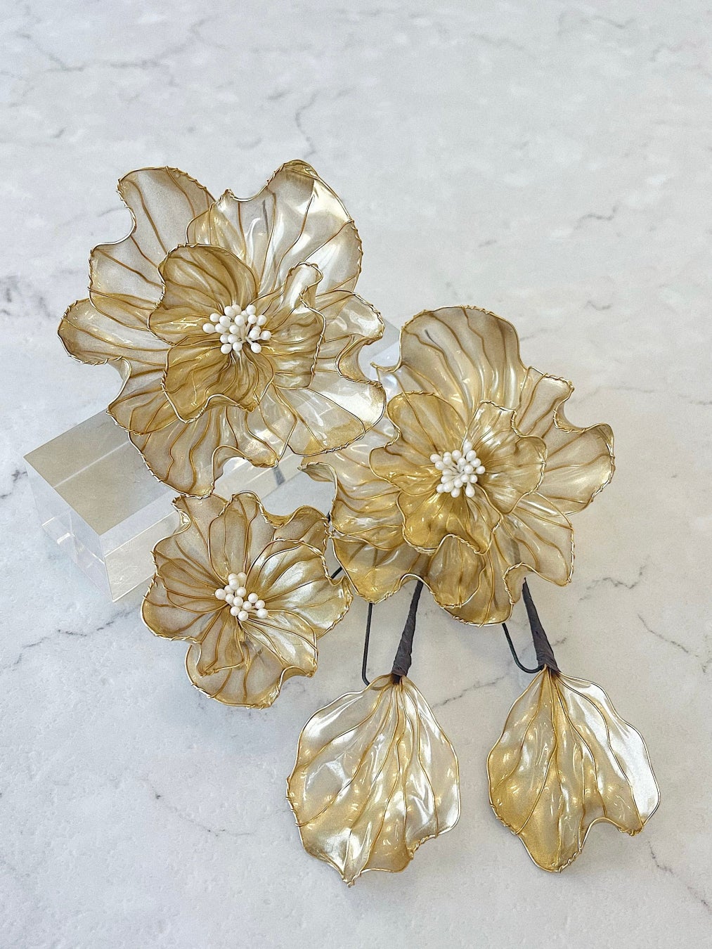 細部までこだわったオリジナルデザインです。約8cmのお花が2つ、約5-6cmのお花が1つ、花びら2枚のセットになっており、このセットのみで素敵なスタイルが完成します。