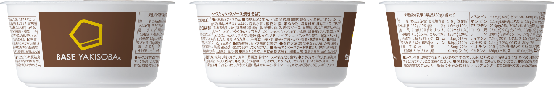 今回のリニューアルでは、デザインも大幅にリニューアル。内容量はほぼそのままですが、カップを小型で持ちやすく、また保管場所に配慮した形状へと変更しました。さらに、フタのデザインも「BASE YAKISOBA」の最大の特徴でもある麺にフォーカスしたデザインを採用しています。