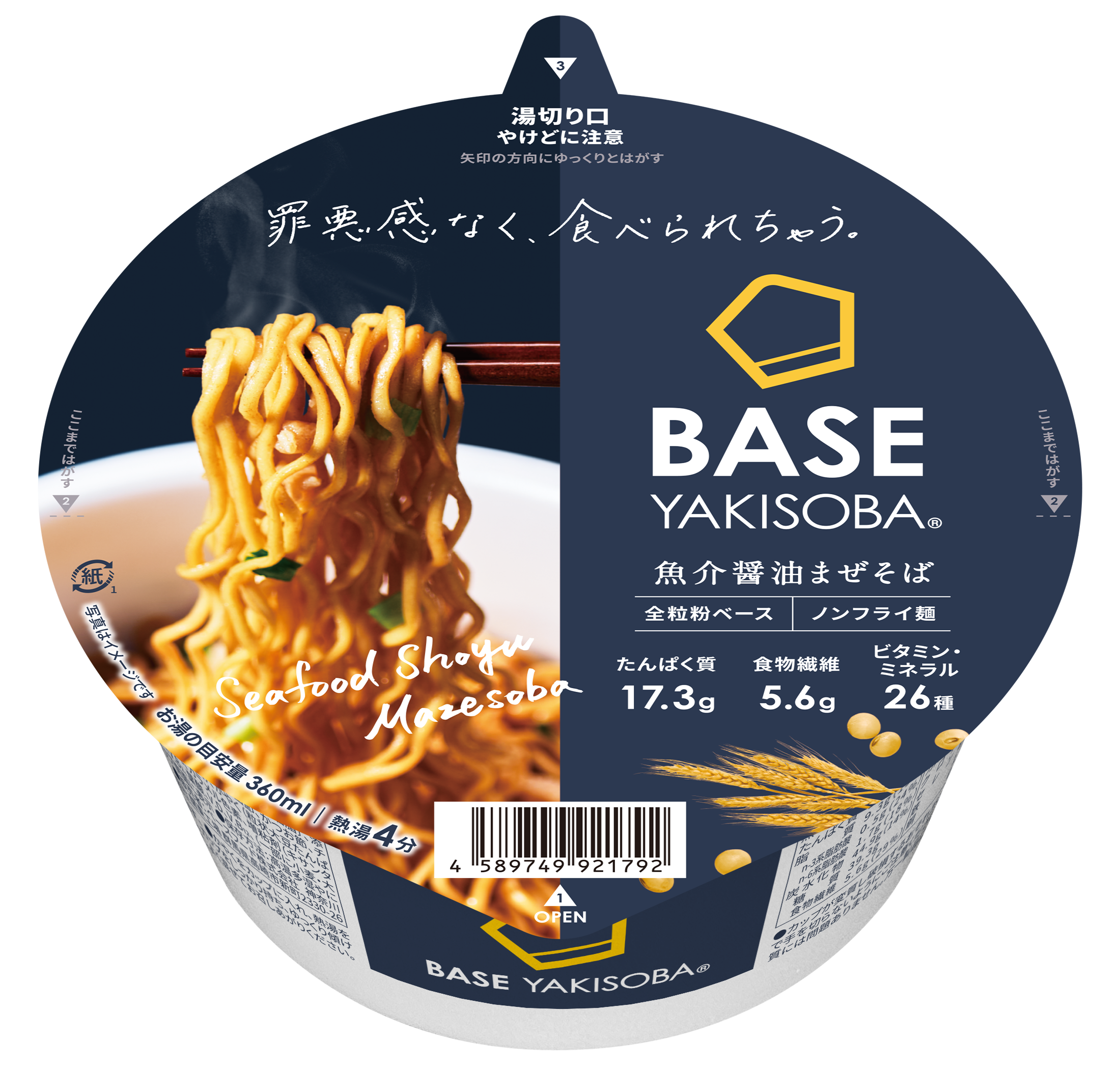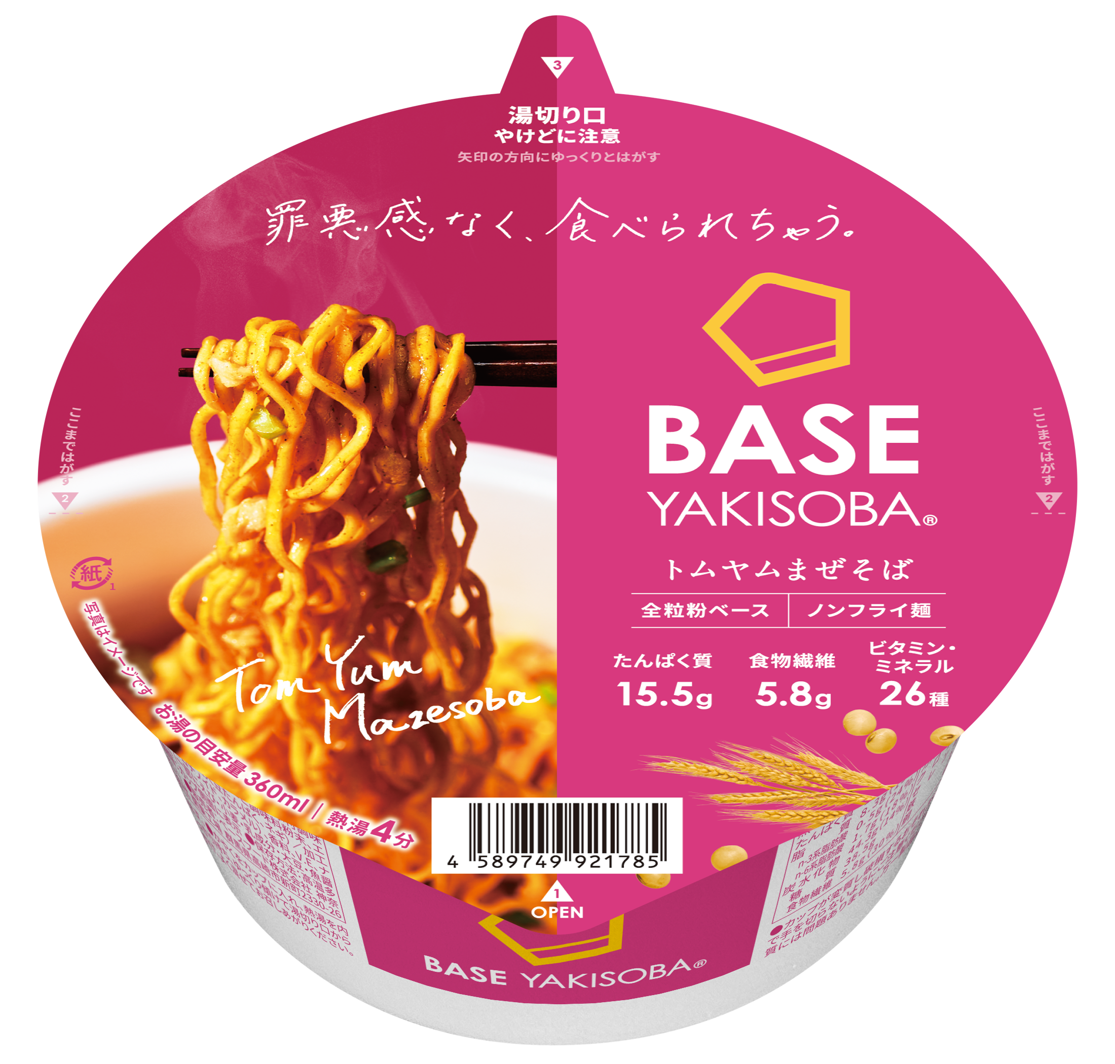 2024年にベースフードでは初となる1食(2個)で完全栄養の即席麺として誕生後、2025年1月に「REBORN版」として生まれ変わった、全粒粉をベースに主に自然由来の原材料を使用したカップ麺「BASE YAKISOBA」シリーズ。“カップ麺は不健康”というネガティブなイメージを払拭する“罪悪感なく、食べられちゃう”商品として、現在「BASE YAKISOBA ソース焼きそば」「BASE YAKISOBA 塩焼きそば」「BASE YAKISOBA トムヤムまぜそば」「BASE YAKISOBA 魚介醤油まぜそば」の4つのフレーバーを発売しています。