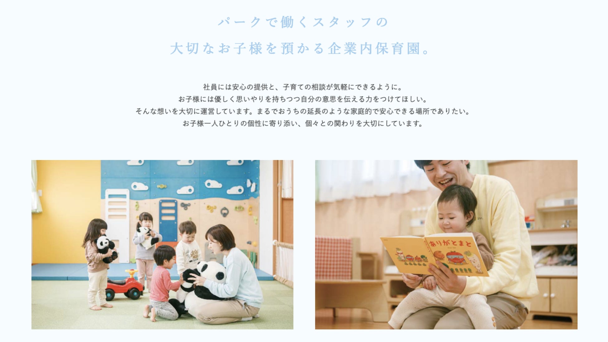 「開設しても利用者が集まらない」という懸念があったため、プロジェクトチームを立ち上げて社員への丁寧なヒアリングを実施。アドベンチャーワールドの豊かな自然や動物との触れ合いを生かして独自のプログラムを導入するなど、期待やニーズに応える自社ならではの保育環境を整えました。