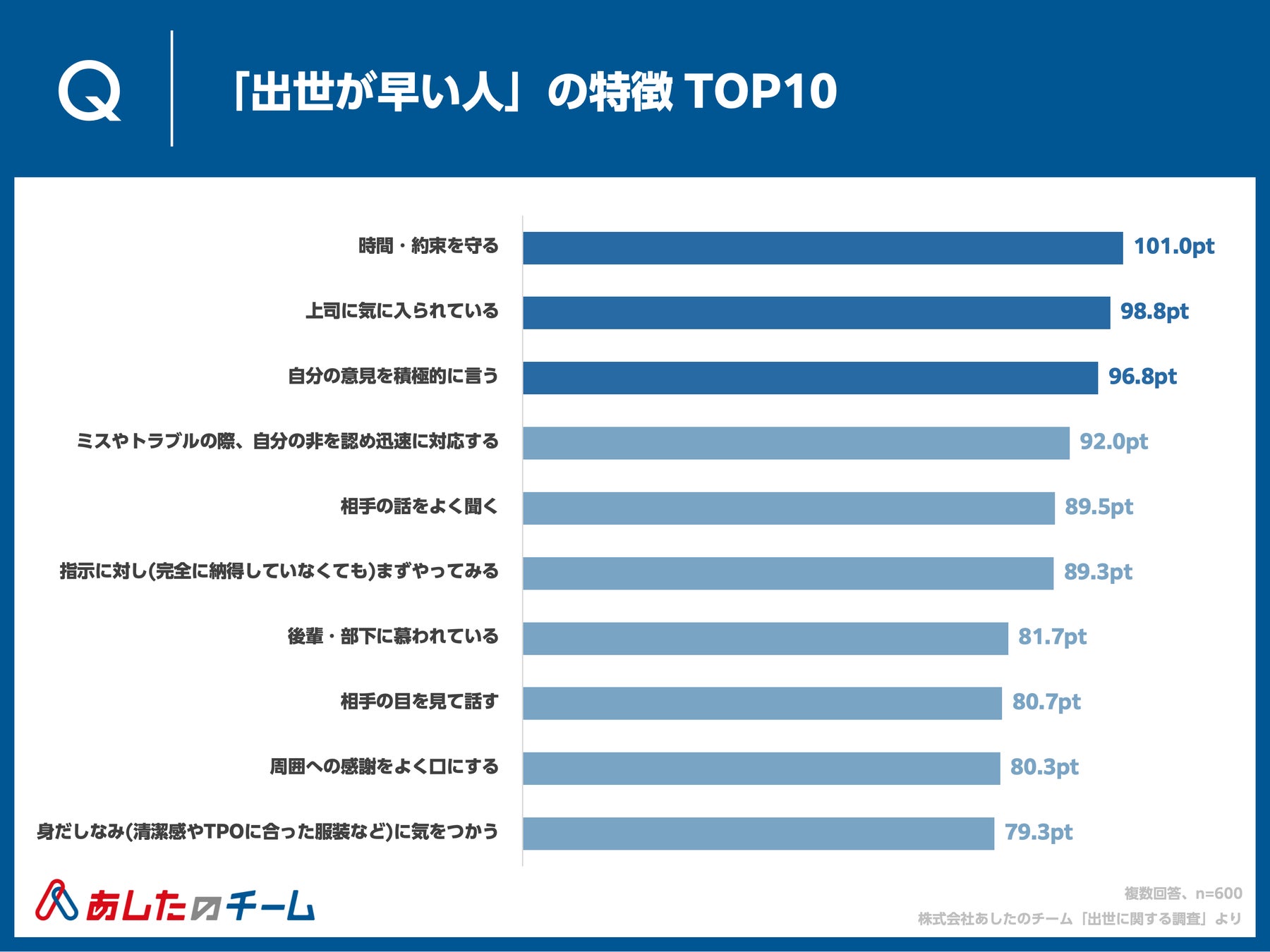 Q. あなたの周囲で「出世が早い人」にあてはまることをお答えください。(複数回答、n=600)