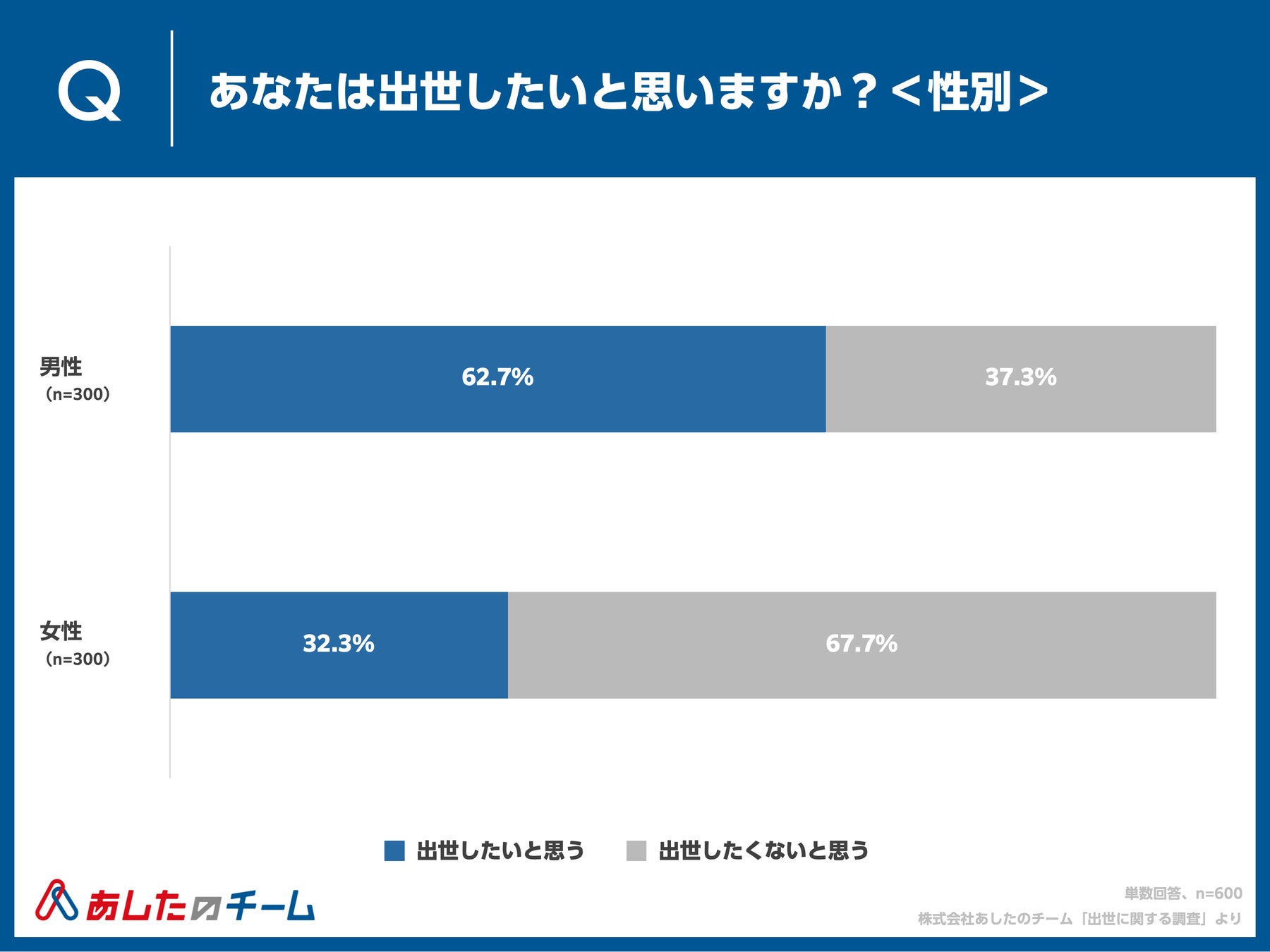 「出世したいと思う」の割合を男女で比較すると、男性 62.7%、女性 32.3%と、「出世したいと思う」女性の割合は男性の約半分でした。