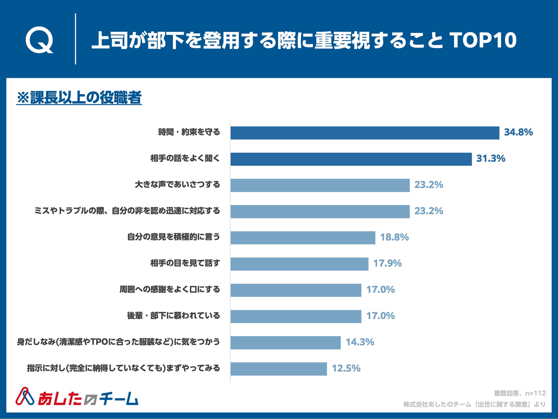 前問の「出世が早い人の特徴」では、「相手の話をよく聞く」は5位、「大きな声であいさつをする」はTOP10圏外(12位)でしたが、実際に部下を登用する際の重要度として聞くとランキング順位が大きく上がりました。1位の「時間・約束を守る」を含め、社会人として基本的なことだからこそ、それをしっかりできている人を登用したいと考えるのかもしれません。同率3位の「ミスやトラブルの際、自分の非を認め迅速に対応する」のように、隠し事をしないことや誠実さも、出世するために重要と考えられているようです。