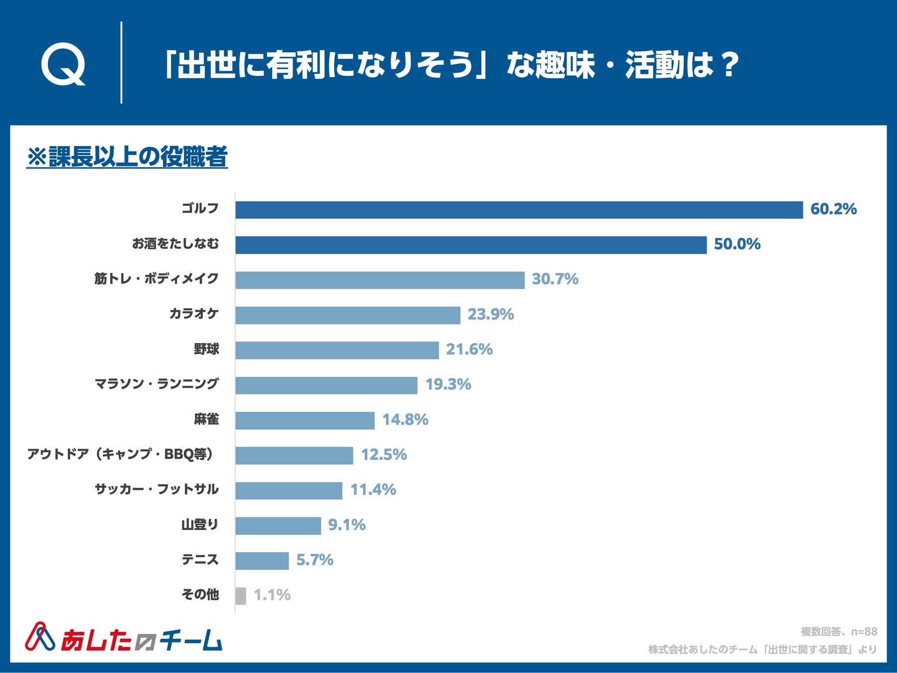 課長以上の役職者の回答でも、「ゴルフ」60.2%、「お酒をたしなむ」50.0%となり、出世における「ゴルフ」と「お酒」の強さが判明しました。ゴルフとお酒に共通するのは、4人前後の人数でコミュニケーションできることと、ビジネスの場ではわからない人柄が見えることでしょうか。上司や取引先の人がゴルフやお酒が好きな場合、誘われやすくなり、キーマンと距離が縮まるきっかけになることもあるかもしれません。