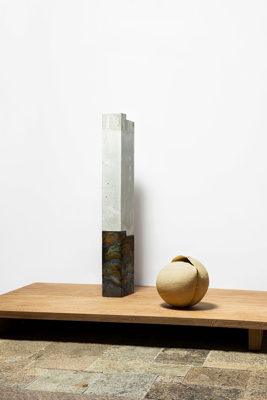 橋本知成(1990年生まれ、和歌山県)は、滋賀県信楽を拠点に活動する陶芸家。2012年京都教育大学教育学部美術領域専攻を卒業。2014年金沢美術工芸大学大学院工芸専攻陶磁コースを修了。2017年金沢美術工芸大学大学院博士後期課程工芸研究領域陶磁分野を修了。作品は、球体や多面体などのミニマルな形態を手捻りで成形し、金属を含んだ釉薬と炭化焼成によって独自の質感と色彩を獲得する。大型作品は空間そのものと呼応し、設置される場に新たな風景を生み出す。焼成条件や素材の不確定性により一つひとつ異なる表情を示し、複雑な色調が立ち現れる。近年は陶とモルタルを組み合わせ、歪みや割れと精緻な直線を対置させることで、新たな知覚領域を切り拓いている。幼少期の自然や造形への関心を背景に制作を続け、2019年LOEWE Craft Prizeファイナリストに選出。作品はV&AやLACMAなど世界の美術館に収蔵され、国際的にも評価されている。