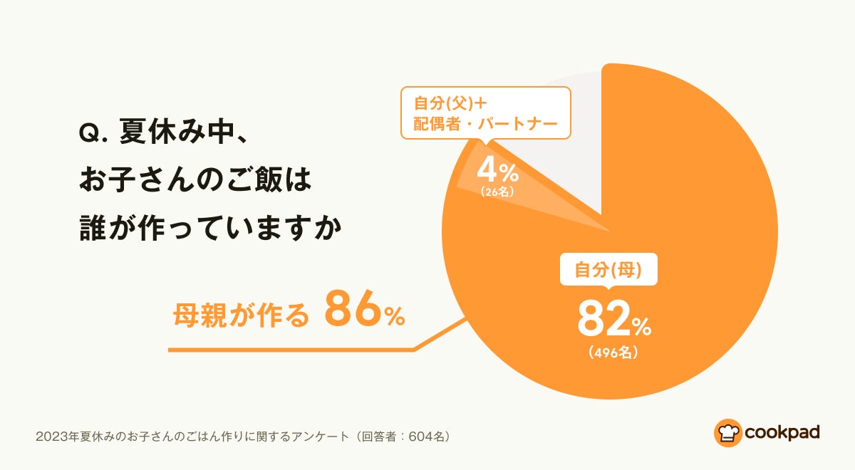 また、「自分(母)」を選択した方と、「自分(父)」と回答した方のうち「配偶者・パートナー」も合わせて回答した方を合わせると522名になり、全体の86パーセントにのぼります。このことから、夏休みの料理の負担は母親に偏っていることが伺えます。