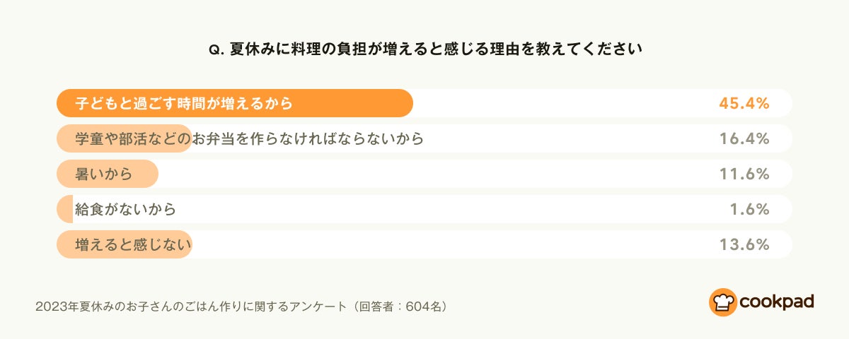 夏休みに料理の負担が増える理由として「子どもと過ごす時間が増えるから」(45%)、「学童や部活などのお弁当を作らなければいけないから」(16%)をあげた人が多かった