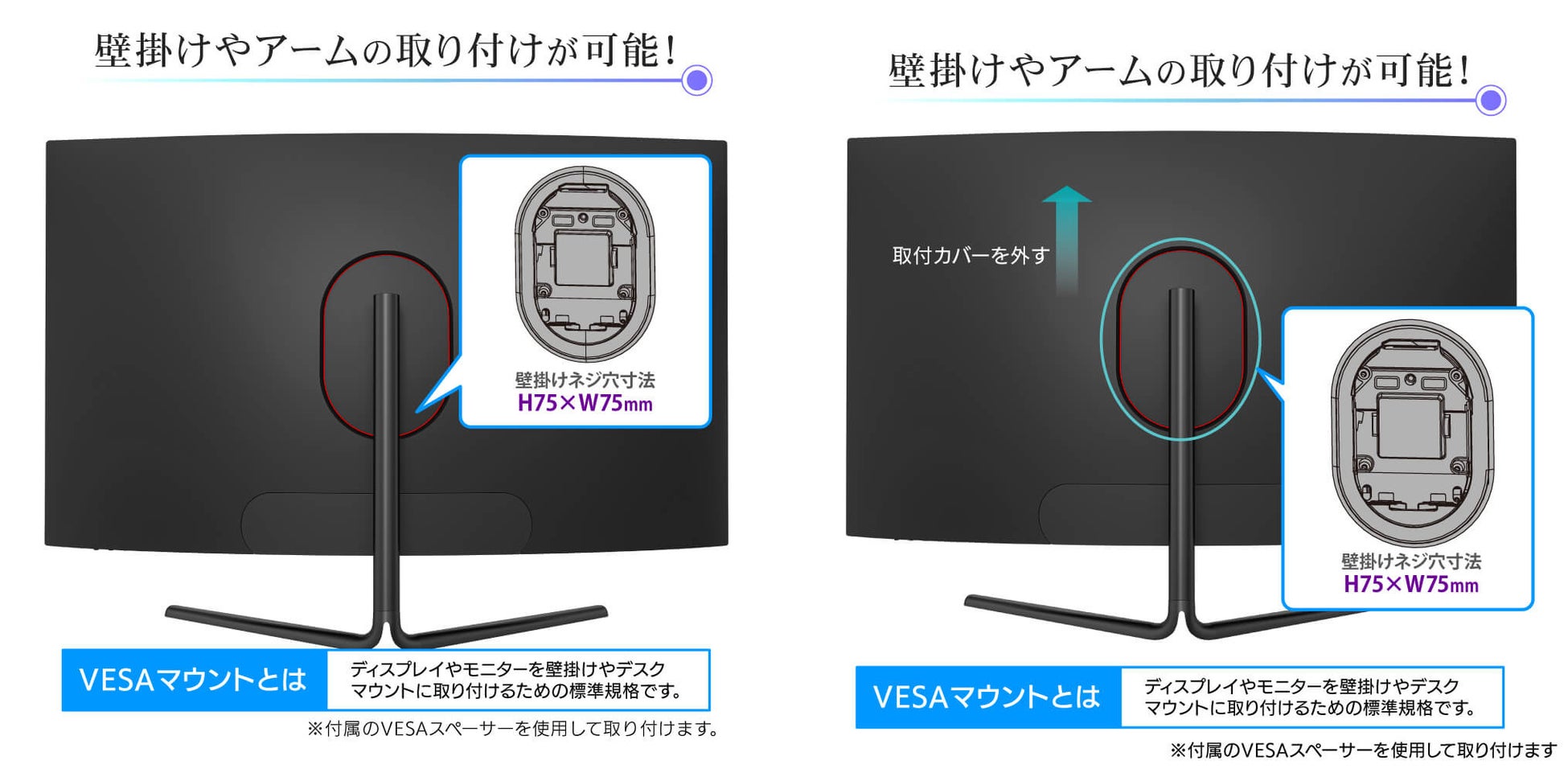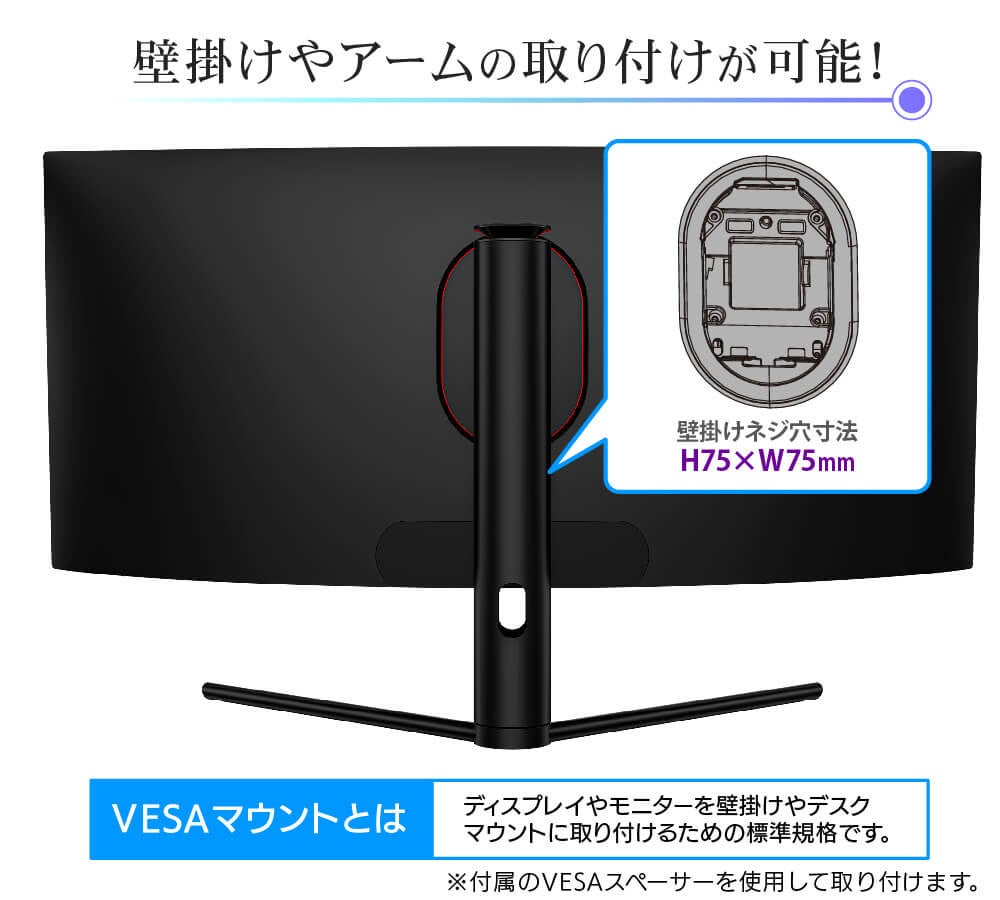 ※VESAマウントとは:ディスプレイやモニターを壁掛けやデスクマウントに取り付けるための標準規格です。