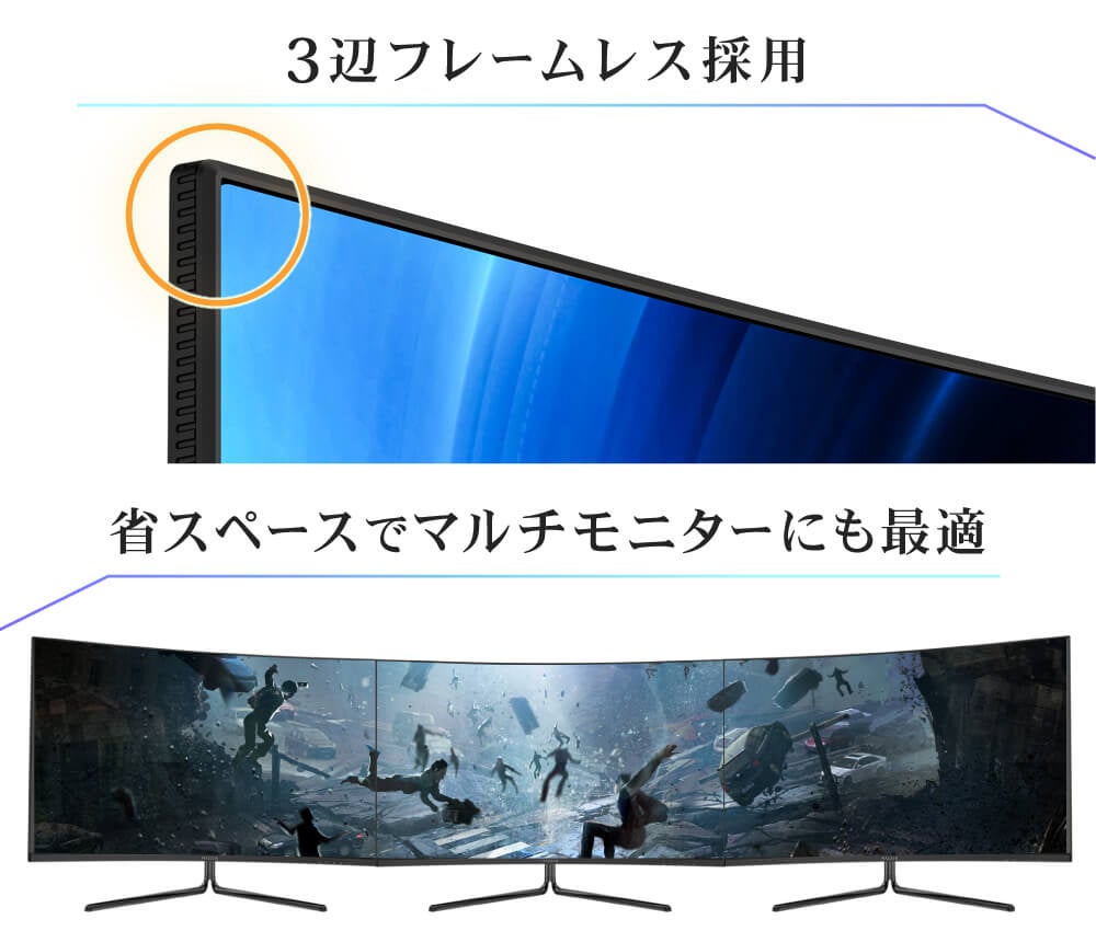 モニターの枠の幅を可能な限り狭くした3辺フレームレスを採用したことで、サイズをフル活用した大画面でゲームを楽しむことができます。また、モニターは自分の見やすい角度に調節することができ、壁掛けやアームに取り付けて使えるVESAマウントにも対応しているので、自分の好みに合わせたモニター環境を構築することができます。そして、並べて置いても画面のつなぎ目が邪魔にならず省スペースなので、マルチモニターにも最適です。なお、モニターのデザインはシンプルな為、設置場所を選ばずに置くことができます。