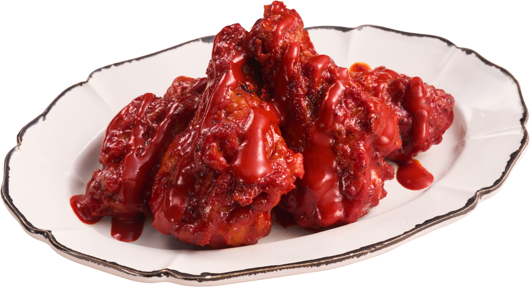 塩コショウで味付けした、炙り焼きチキンに激辛ブラッディソースを絡めました。