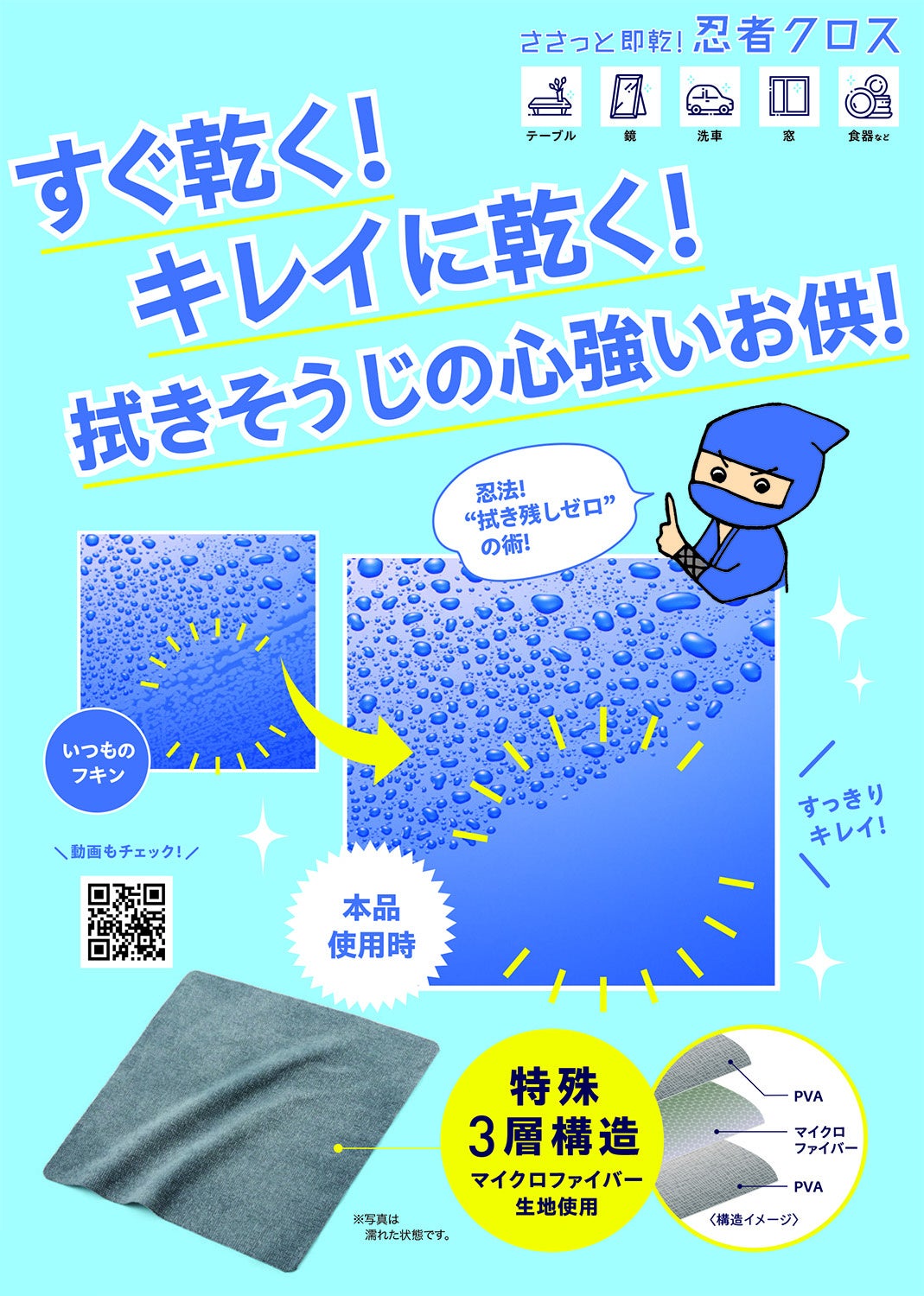 秒で乾く!忍法!“拭き残しゼロ”の術!「ささっと即乾!忍者クロス」を9月1日より発売