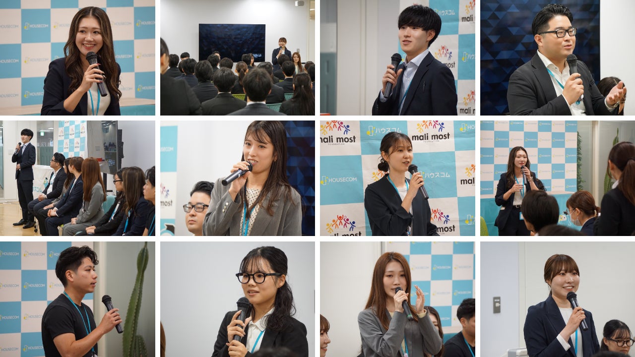 今年の内定式は、ハウスコムの先輩社員8名による自己紹介から始まりました。続いて、店舗スタッフからの動画メッセージが上映され、内定者への歓迎の気持ちが届けられました。