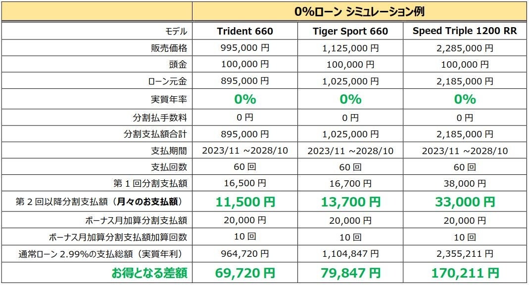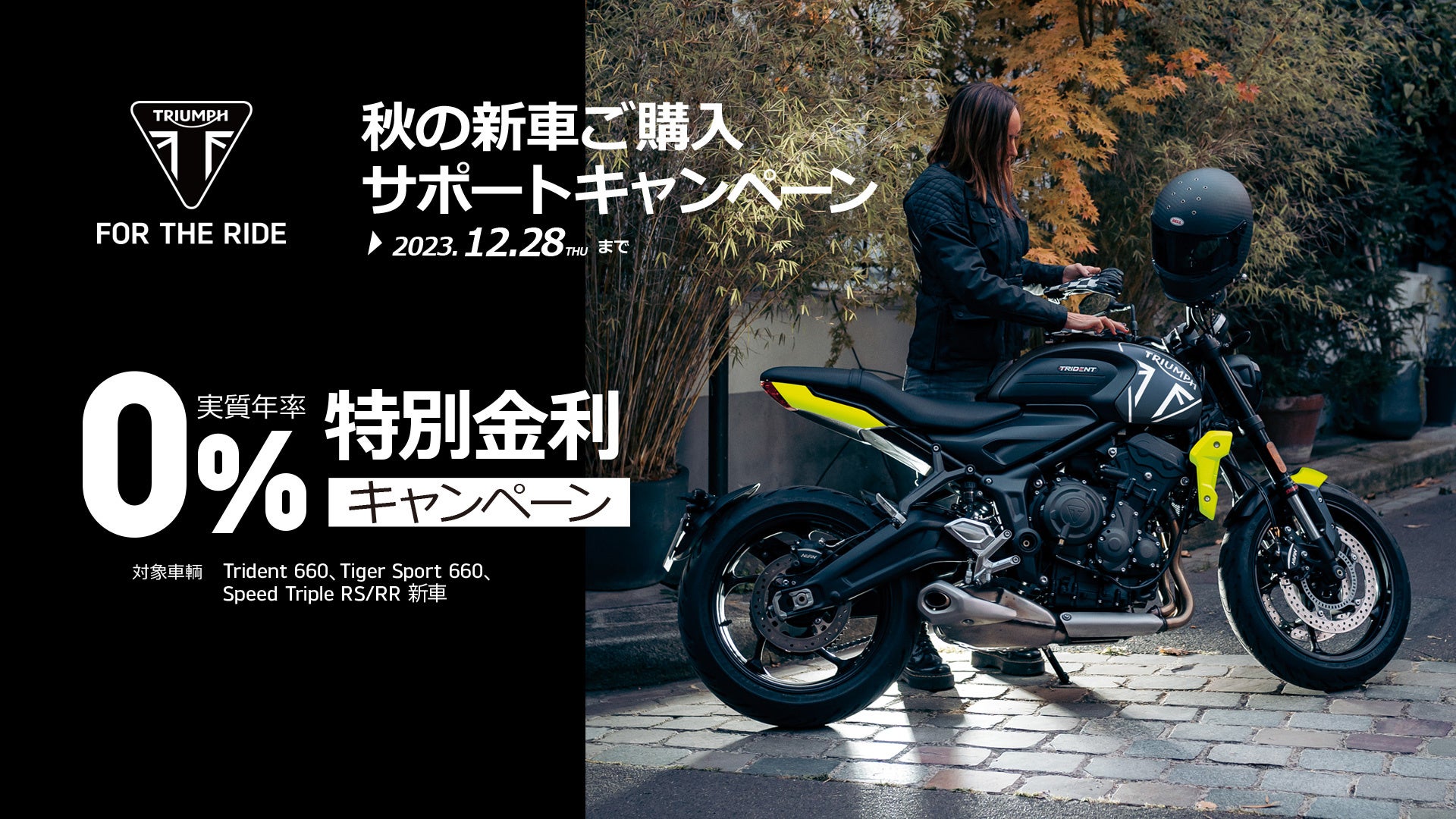 内容:キャンペーン期間中、全国のトライアンフ正規販売店にて対象車両をご成約、且つローン契約完了していただいたお客様に、「0% 特別金利ローン」をご提供いたします。