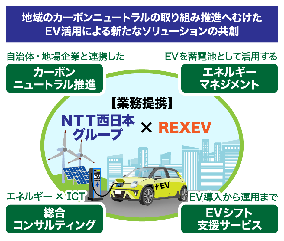 NTT西日本グループでは、NTTグループ各社と連携し、地域社会のカーボンニュートラル推進に取り組んでいます。この一環として、お客さまのEV導入時における諸課題を総合的に解決することでEVシフトを支援し、温室効果ガスの削減へ貢献していくソリューションの開発を進めています。このソリューションの実現に向け、EVを”モビリティ”と”蓄電池”の価値を統合して管理する新たなエネルギーマネジメントの技術システムを有するREXEVと業務提携し協業を進めます。