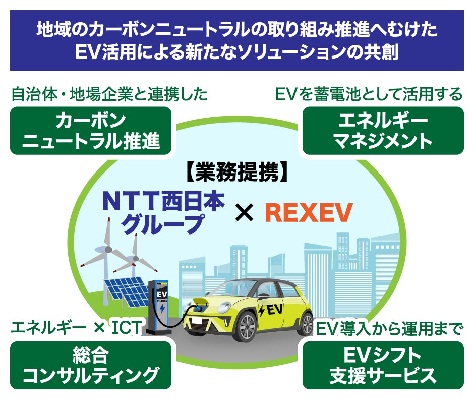 具体的には、NTT西日本グループの再生可能エネルギーとICTを統合した総合コンサルティングと、REXEVのEVエネルギーマネジメントに関する技術システムを組み合わせることにより、再生可能エネルギーとEVの普及を促進し、カーボンニュートラル社会の実現に貢献する各種ソリューションを共創していきます。
