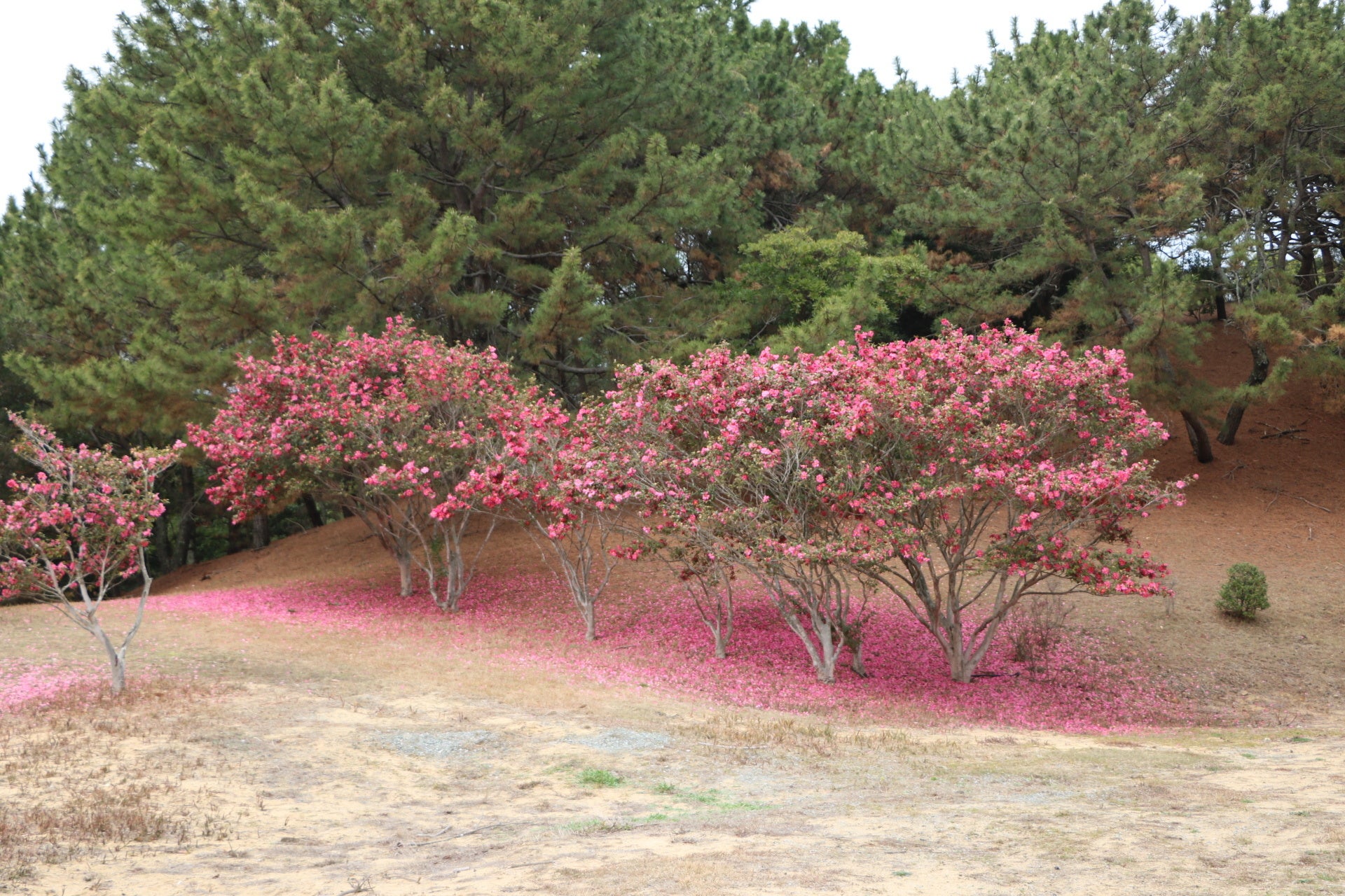 園内各所で見られます。1月中旬には紅色の花びらが地表に降り積もり、絨毯のようになって美しいです。