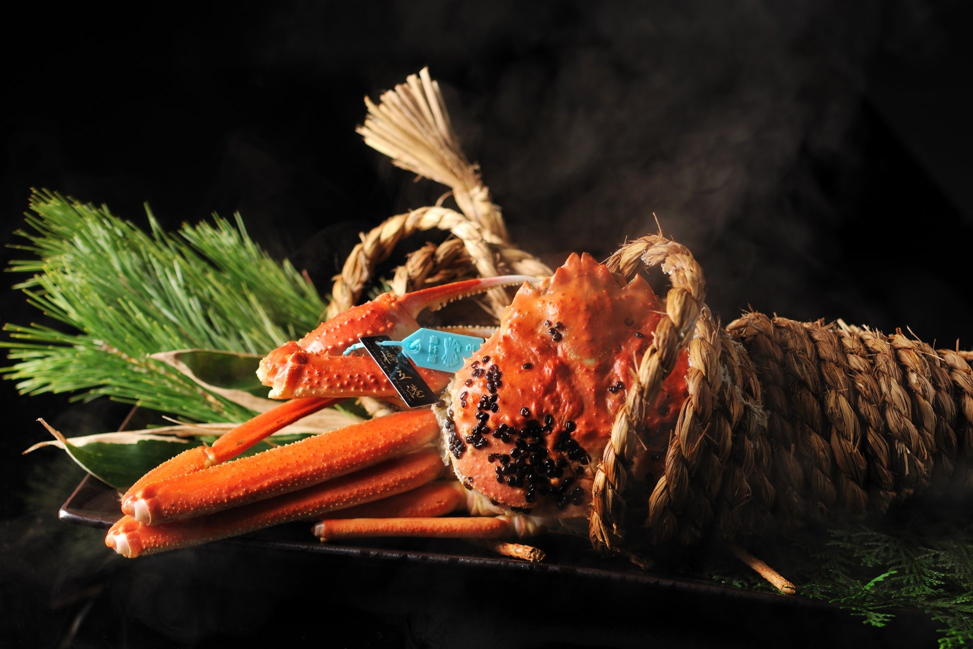蟹料理の古い文献に「埋め焼き(うずめやき)」という、囲炉裏の灰の余熱を使って魚介類を蒸す調理法が残されています。これは、灰が身に付かないように縄で巻いたと伝えられています。この調理法にヒントを得て、生きた蟹を塩水に浸した縄で結わえて蒸す調理法を考案しました。蟹を直接蒸すのとは異なり、縄を介して間接的に加熱するので、蟹の身に蓄えられた水分が失われず、よりジューシーに蒸すことができます。