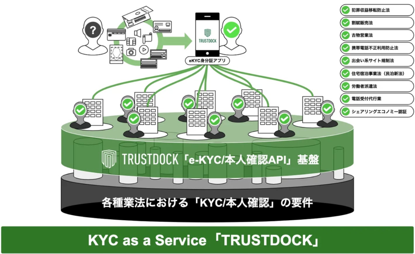 KYC as a Service「TRUSTDOCK」が提供している、デジタルIDウォレットとeKYC本人確認APIサービスでは、犯罪収益移転防止法をはじめ、携帯電話不正利用防止法、古物営業法、労働者派遣法、出会い系サイト規制法、民泊新法など、各種法律に準拠したKYCをAPI組み込みのみで実現します。