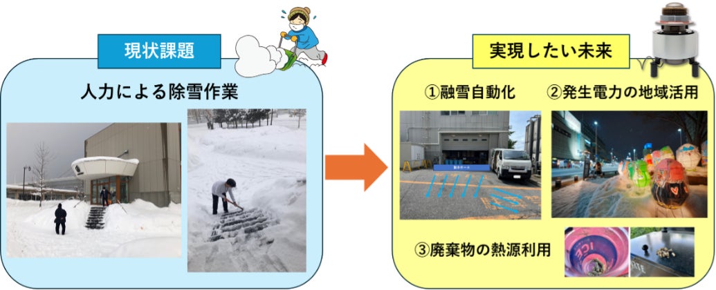 本プログラムの実証実験では、積雪を溶かし電気を作る積雪発電の仕組みを利用し、地方の除雪に係る課題を解決する持続可能な融雪モデルを開発します。また、地域で生じた廃棄物を熱源として活用した地域循環型モデルを目指すほか、発電電力のさまざまな利活用について検討します。