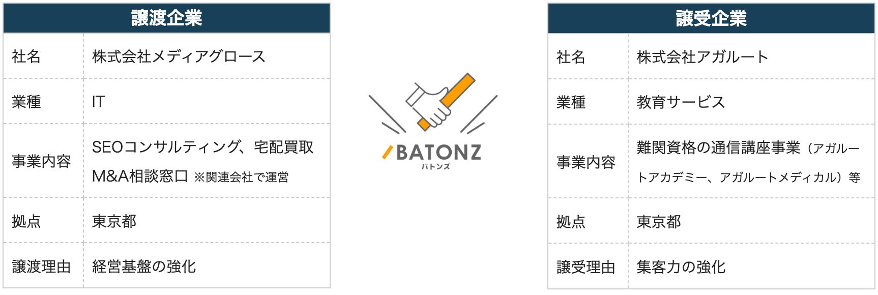 M&A・事業承継支援プラットフォーム「BATONZ(バトンズ)」を運営する株式会社バトンズ(本社:東京都中央区、代表取締役CEO:神瀬悠一、以下バトンズ)は、株式会社サイトストック(本社:東京都渋谷区、代表取締役:渡邉真人)とともに、株式会社アガルート(本社:東京都新宿区、代表取締役:岩崎北斗、以下アガルート)と、株式会社メディアグロース(本社:東京都新宿区、代表取締役:舟崎友貴、以下メディアグロース)のM&A成約を支援したことをお知らせします。