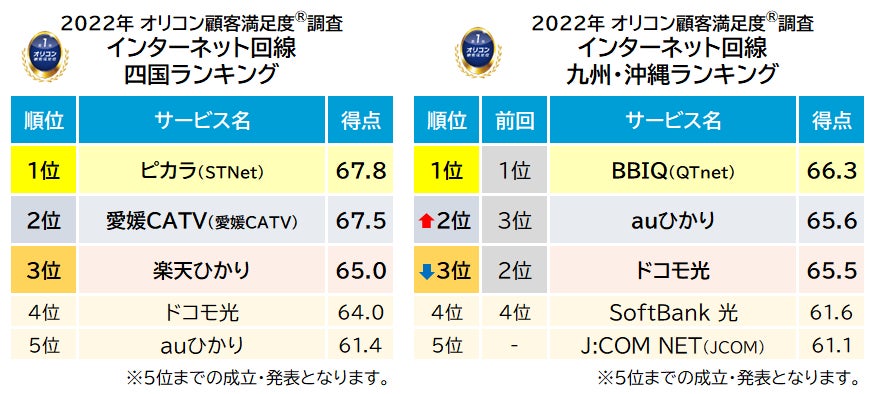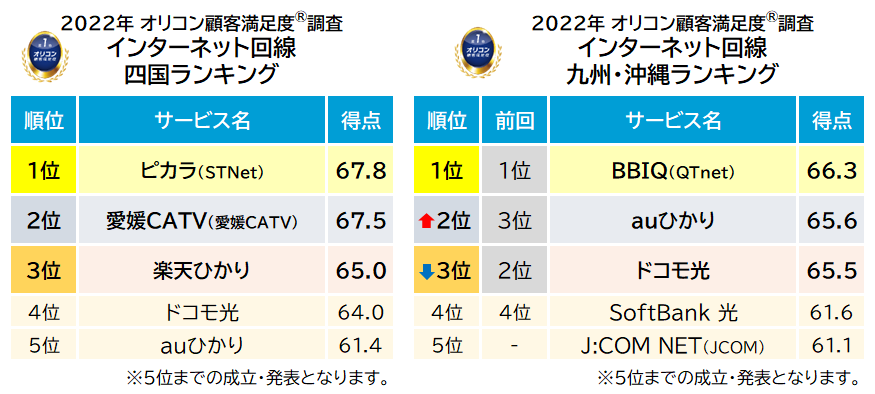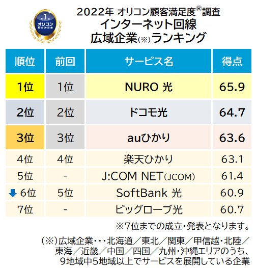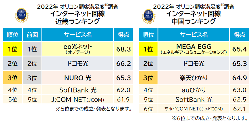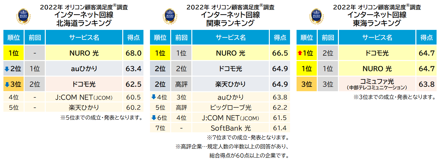 2022年 オリコン顧客満足度(R)調査 『インターネット回線 広域企業 or 地域名』ランキング
