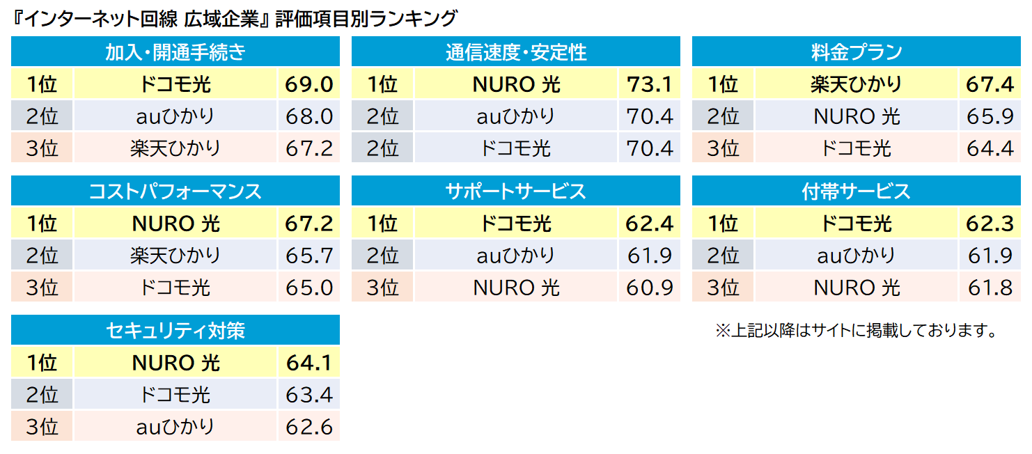 なお、「加入・開通手続き」「サポートサービス」「付帯サービス」では【ドコモ光(株式会社NTTドコモ 本社:東京都千代田区)】が、「料金プラン」では【楽天ひかり(楽天モバイル株式会社 本社:東京都世田谷区)】が1位となりました。