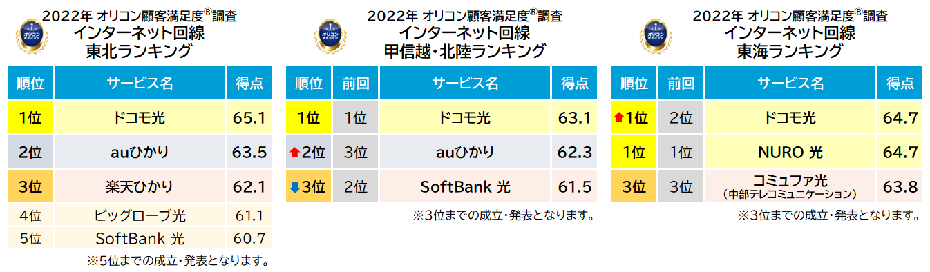 - 『東北』『甲信越・北陸』『東海』では【ドコモ光】が総合1位に