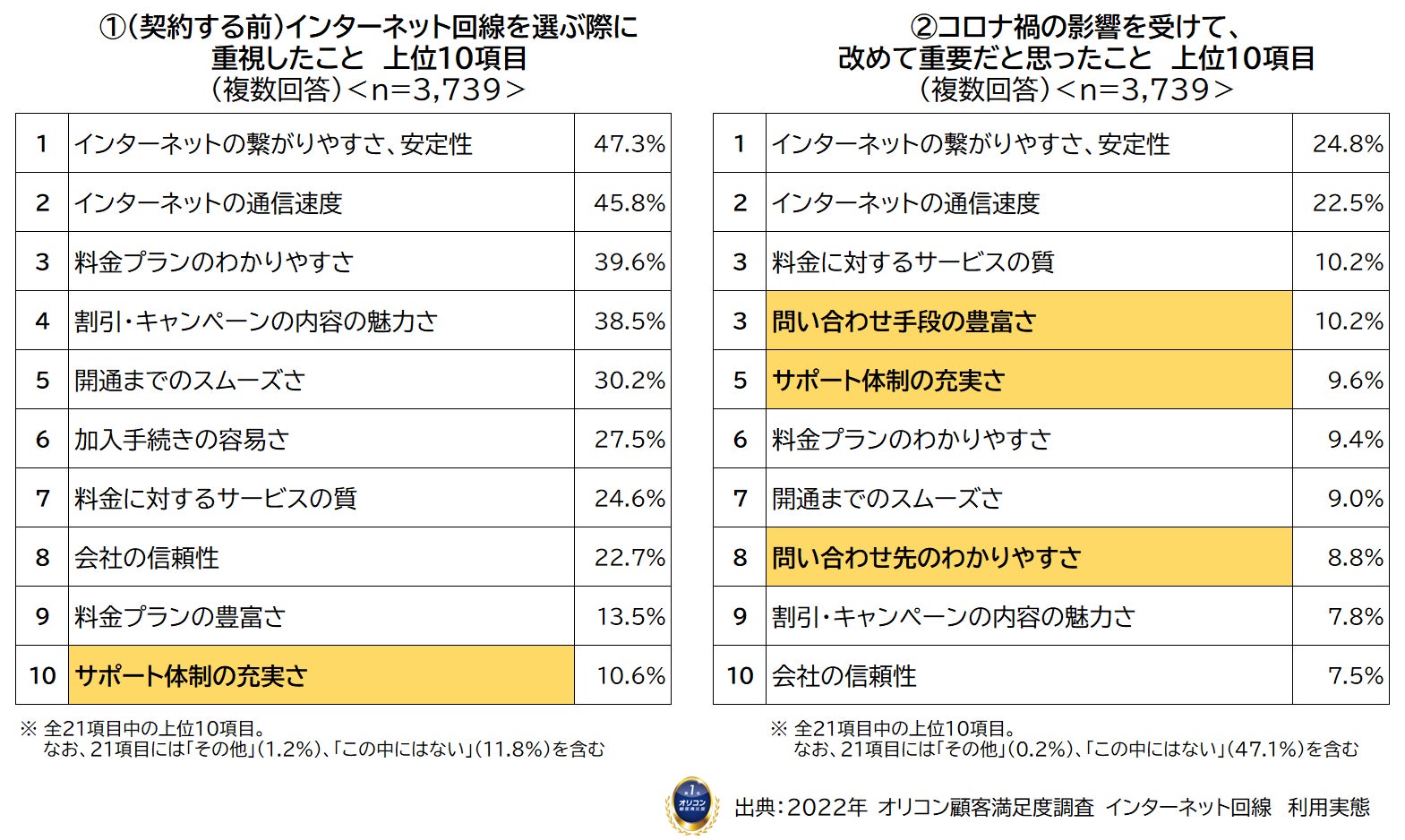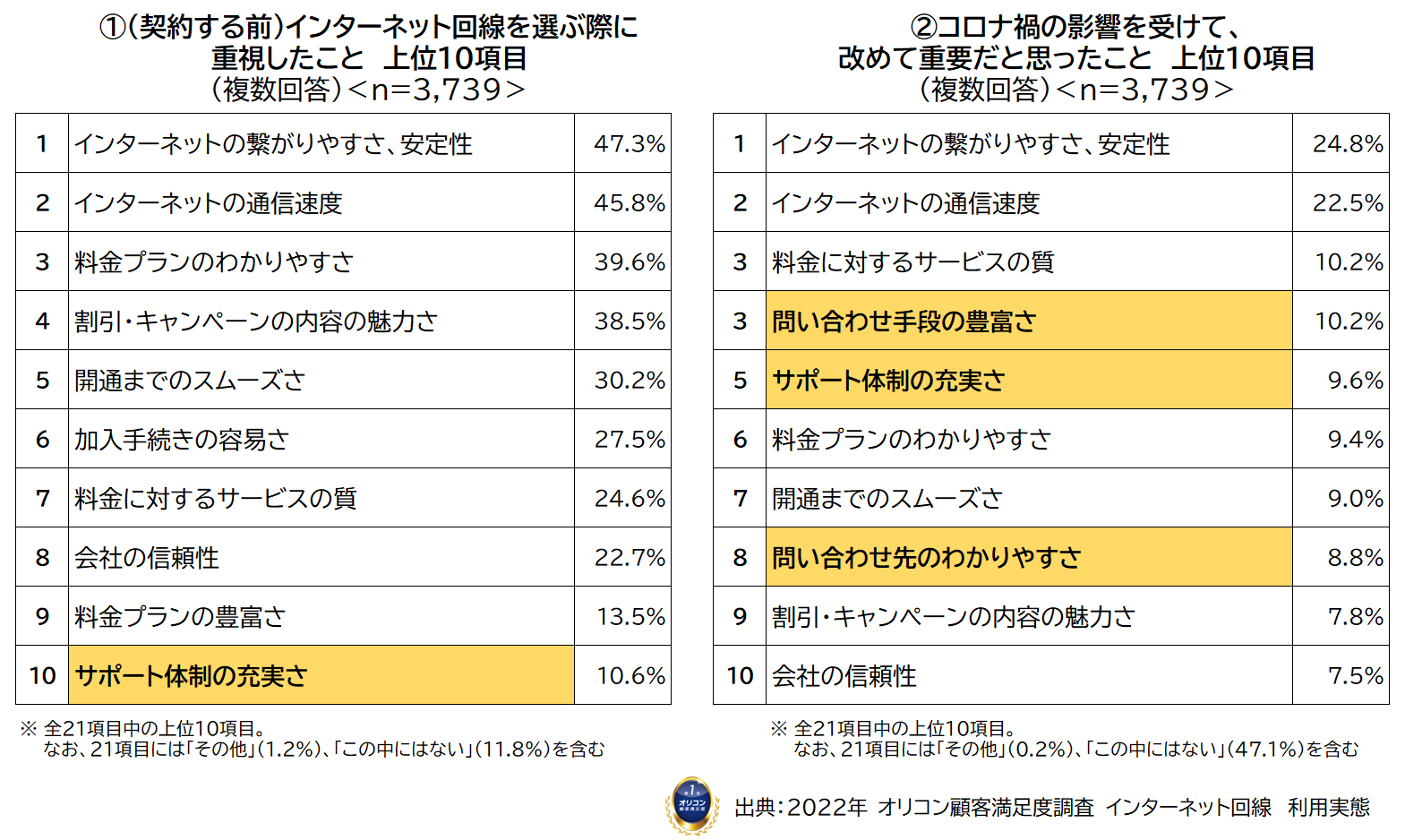 つづいて、②「コロナ禍の影響を受けて、改めて重要だと思ったこと」<複数回答>では、上位2項目には①と同様「繋がりやすさ、安定性」「通信速度」が入り、次いで「料金に対するサービスの質」、「問い合わせ手段の豊富さ」(①では10番目以下)、「サポート体制の充実さ」(①では10番目)が続きました。また、「問い合わせ先のわかりやすさ」(①では10番目以下)の項目も上位に。コロナ禍の影響を受け、オンライン化の需要増とともに“問い合わせ・サポート体制”といったサポートサービスが改めて重要視されていることが伺える結果となりました。