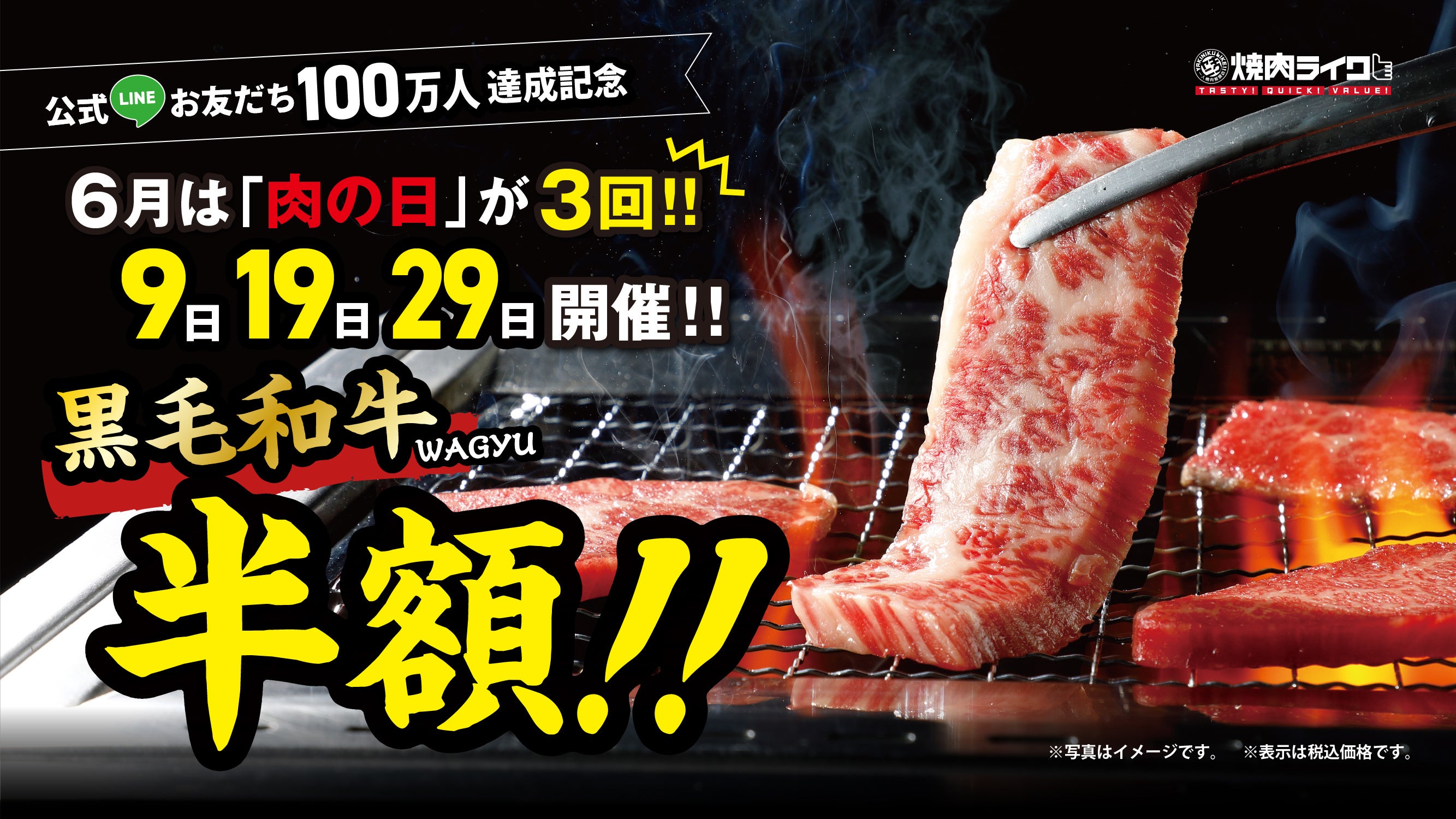 【焼肉ライク】今月は黒毛和牛が半額になる”肉の日”が3回!LINE公式アカウントお友だち100万人突破記念で6月9日(金)・19日(月)・29日(木)の3日間、全店舗で開催!