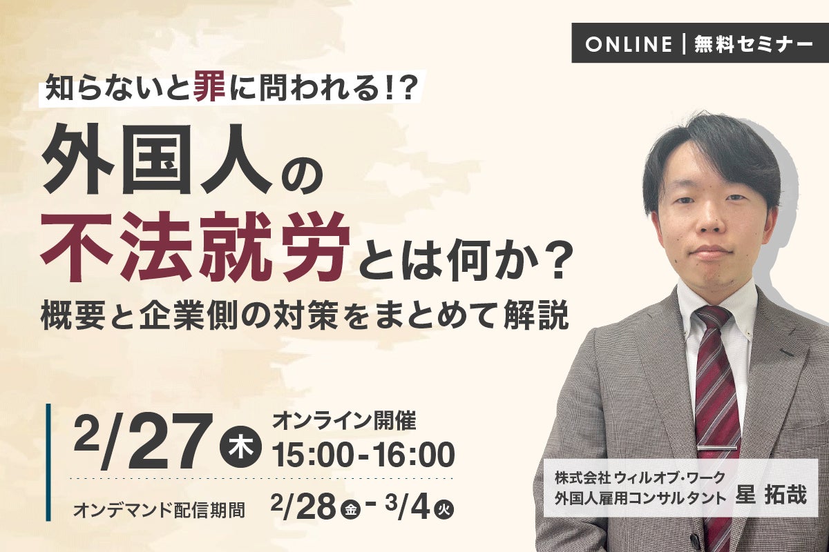 ウィルグループの総合人材サービスを手掛ける株式会社ウィルオブ・ワーク(本社:東京都新宿区、代表取締役社長:村上 秀夫)は、無料オンラインセミナー『知らないと罪に問われる!?外国人の不法就労とは何か?概要と企業側の対策をまとめて解説』を、2025年2月27日(木)に開催します。