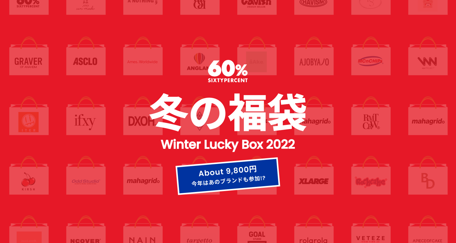 毎年発売後約1分で即完し話題を呼ぶオンラインストア「60%」(シックスティーパーセント)が主催する「冬の福袋」が、2022年12月1日 20時より販売することが発表された。今回の「冬の福袋」の販売価格は9,800円(配送料別)と14,900円(配送料別)の2種類となり、福袋の中身は約2倍相当の商品が内包されている。全て60%(シックスティーパーセント)での独占販売となる。2021年の冬の福袋では、約40ブランドが参加し、人気ブランドは発売後10秒〜数分で即完が相次ぎ、注文ができない程の人気となった。