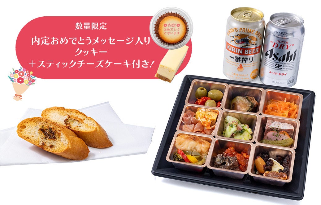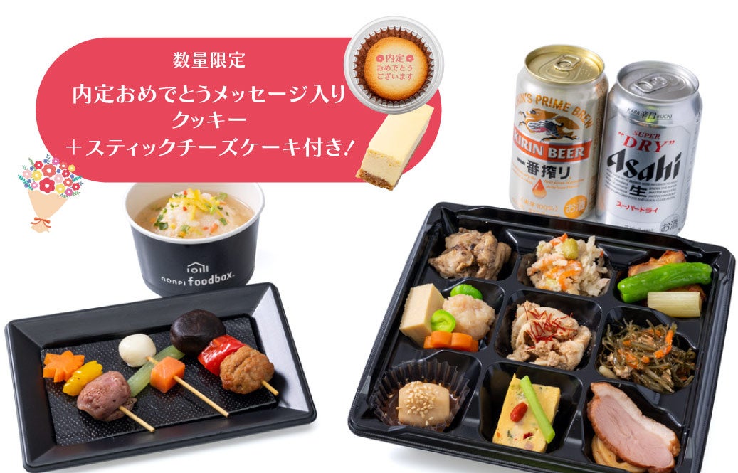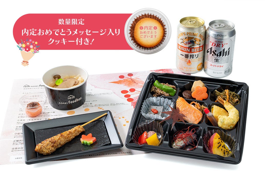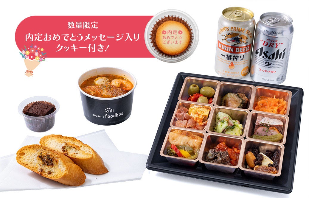 nonpi foodbox® for onlineの人気プランに、内定者の方に喜んでいただけるようなメッセージ入りクッキーやチーズケーキを追加したプランを4種ご用意しました。和洋のバリエーションもあり、料理の内容は内定者が個別選択することも可能です。