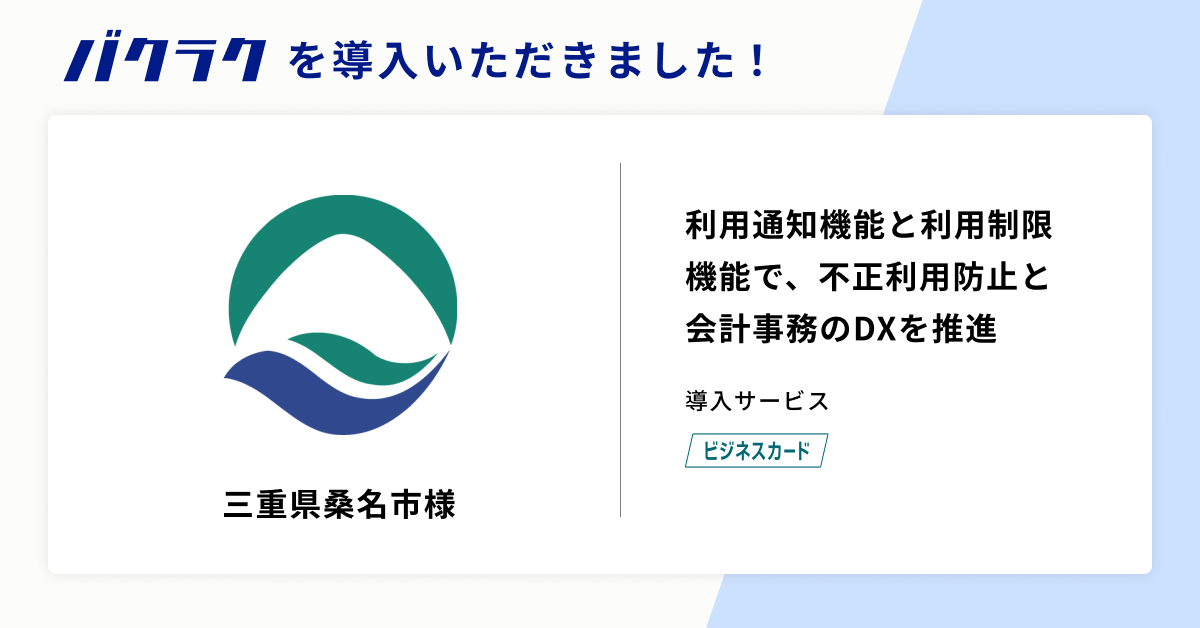 三重県桑名市が「バクラクビジネスカード」を導入。利用通知機能と利用制限機能で、不正利用防止と会計事務のDXを推進