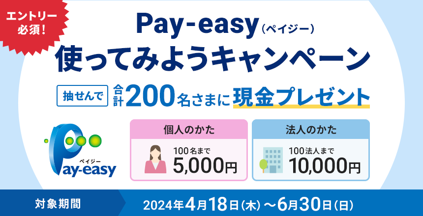 Pay-easy(ペイジー)の取扱い開始に伴い、「Pay-easy(ペイジー)使ってみようキャンペーン」を実施いたします。
