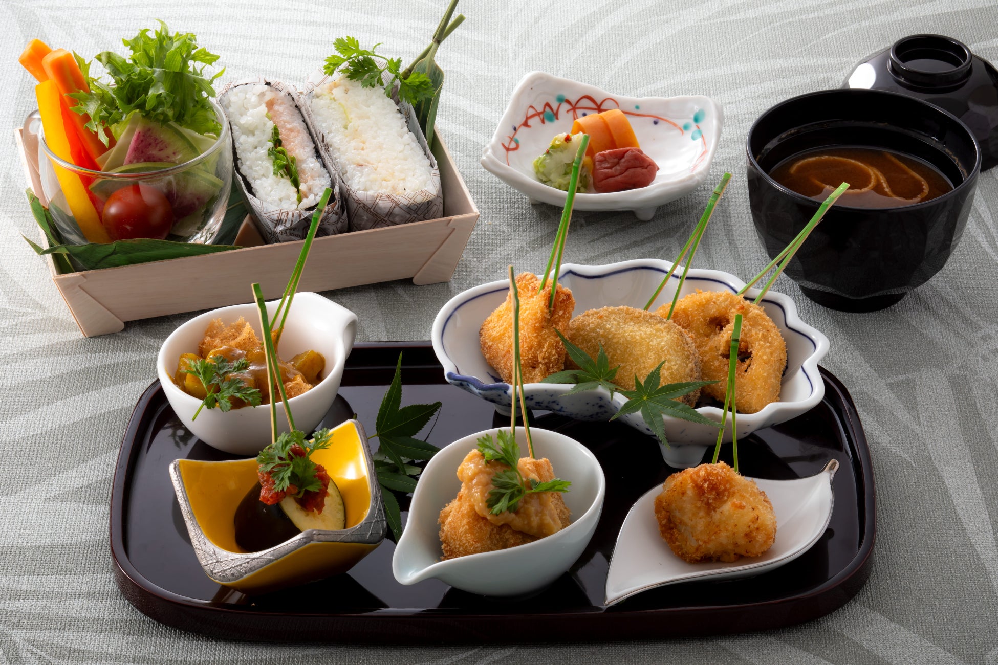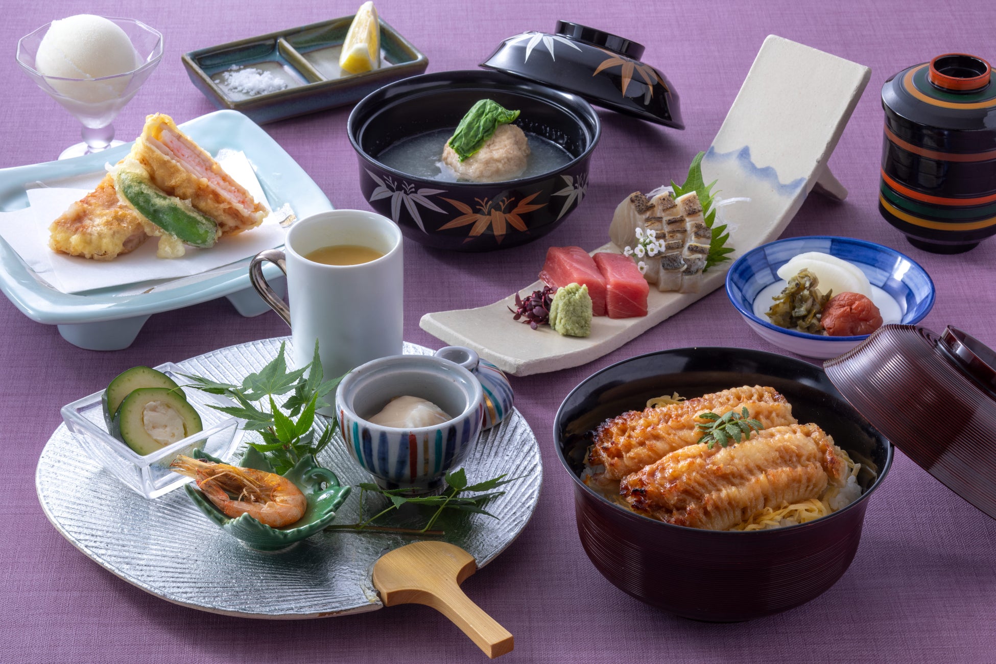 淡路島産鱧や玉葱、但馬どりなど兵庫食材が満載の昼会席。前菜は、トウモロコシやズッキーニなど夏野菜を使った爽やかな品々を盛り合わせて。椀物は、淡路産玉葱のすり流しと但馬どりつくね、揚げ物はサクサクの蓮根と海老のはさみ揚げが登場。夏魚の代表格・淡路島産鱧は、錦糸玉子と合わせて照り焼き丼に。脂ののったスタミナ味で夏の元気を応援します。