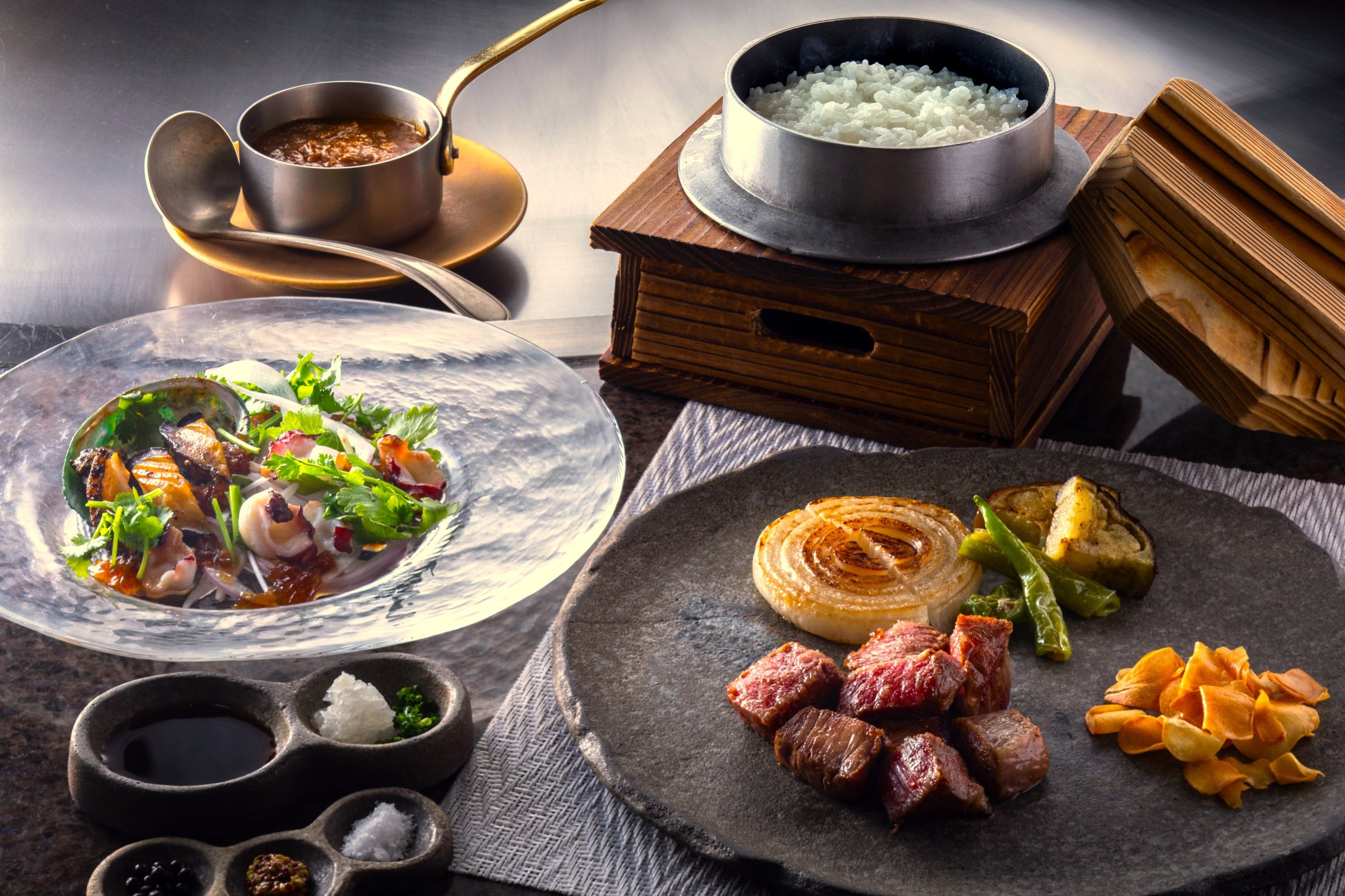 西播磨地域で肥育された“サシよし、肉質よし”の姫路和牛ステーキがメインの鉄板焼コース。前菜は、ぷりぷりの明石蛸や鮑のソテーに、食欲を刺激する香味豊かなエスニックソース「ナムチムタレー」をかけた品が登場。姫路和牛の余韻ある風味を堪能した後は、鉄板で炊き上げたご飯とともに、甘くてスパイシーな神戸ビーフのプチカレーをお愉しみください。