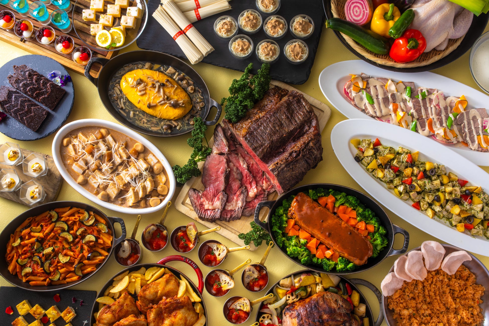 神戸ポークのBBQローストや兵庫県産チキン入りのキッシュなどの肉料理のほか、淡路島玉葱とナスのビシソワーズ、播州そうめんの担々豆乳味噌スープ仕立てなど、随所に兵庫県産食材の個性が光る品々が登場。創作性のある多彩な味で魅了します。朝倉山椒のテリーヌショコラやささやまサイダーを使ったゼリーなど、兵庫ならではのデザートにもご注目を!