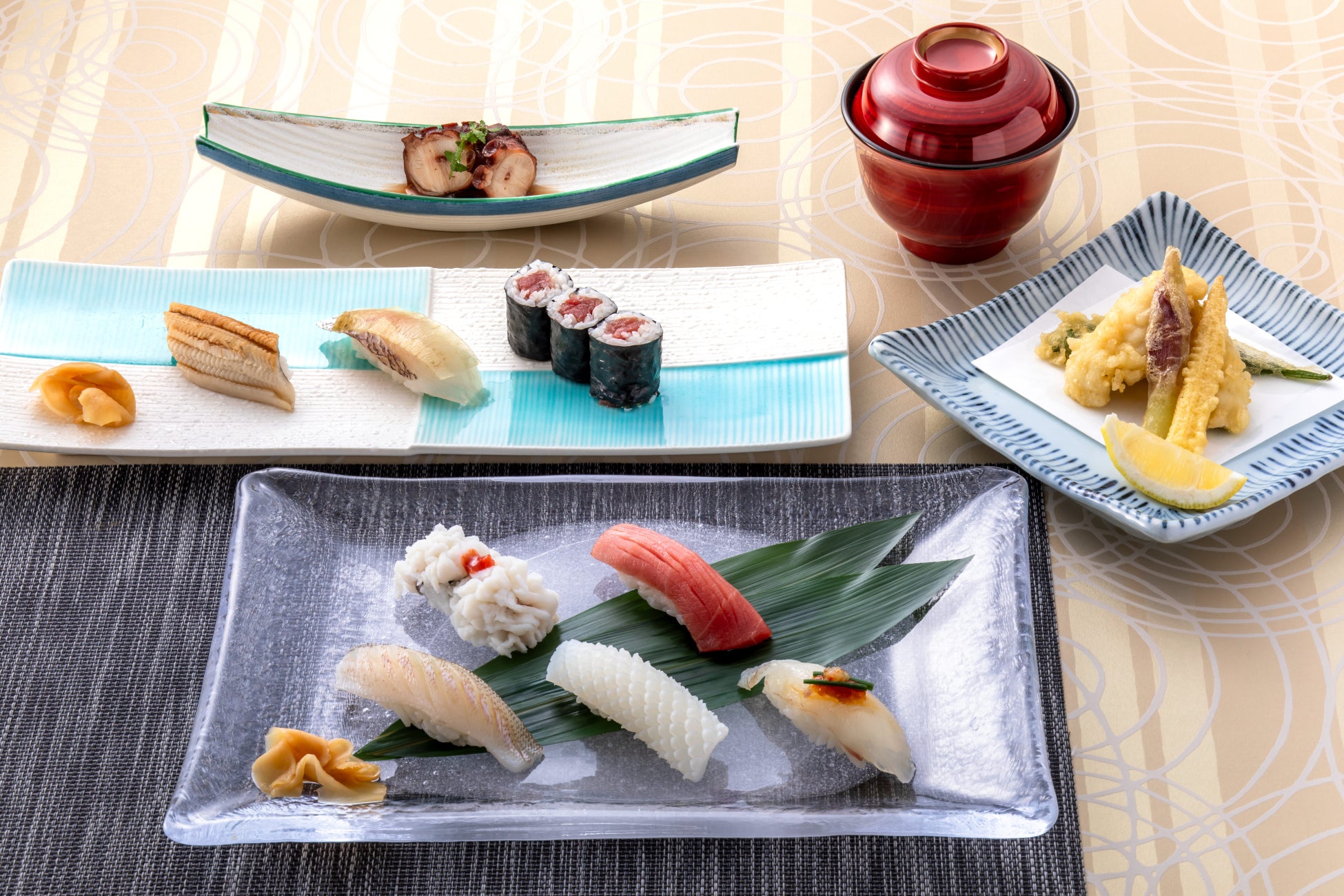 寿司は、身の締まった湯引き鱧、さっぱりとした小鯛の柚子昆布〆、上品な香味のキスなど、兵庫県の魚を中心にした握り7 貫に加え、鉄火巻も登場。口の中ではらりとほどけるシャリが魚の繊細な持ち味を引き立て、口福な時間が押し寄せます。ほかに旬素材の先付、兵庫県産鱧と夏野菜の天ぷらも付く充実の内容。