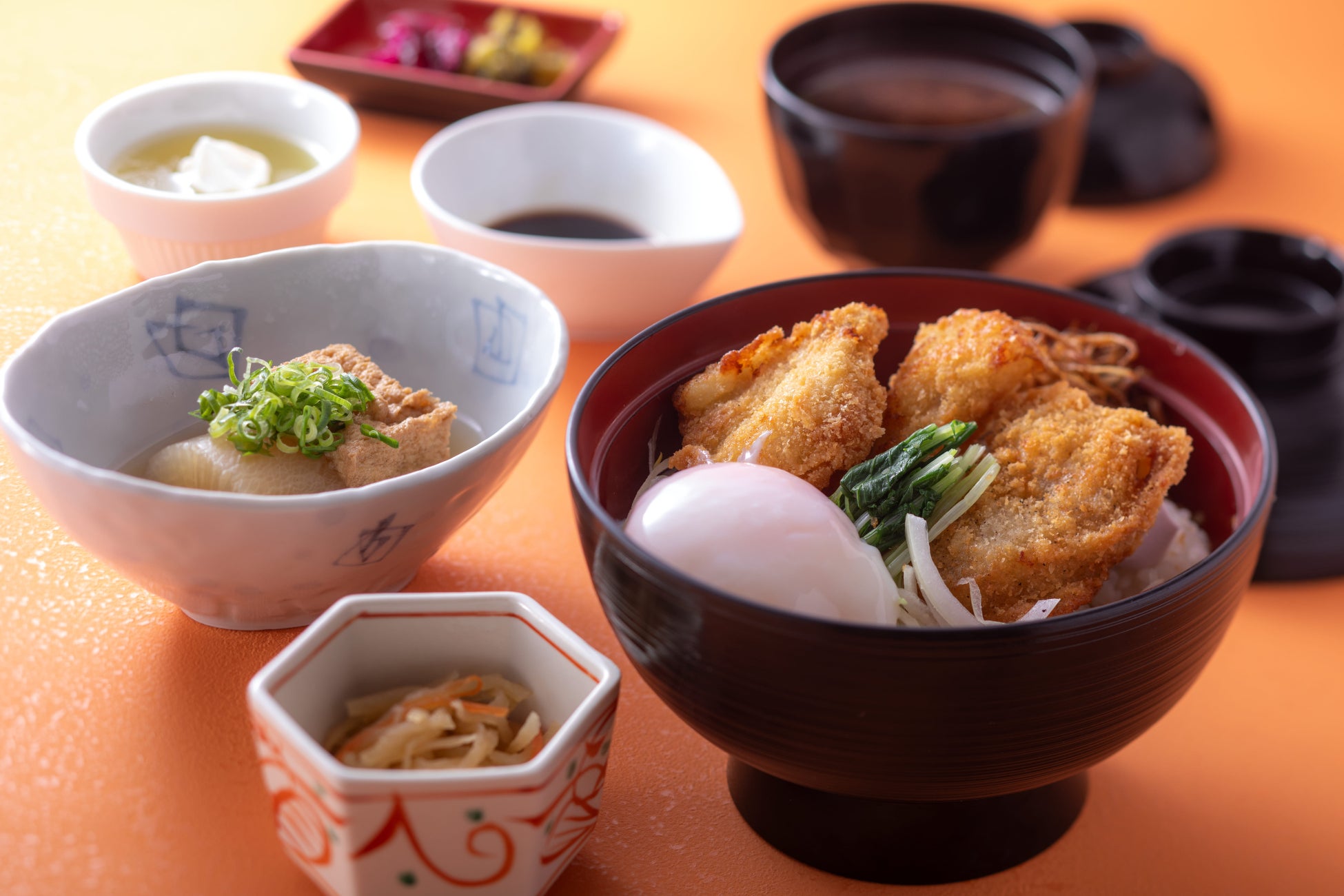 淡路産玉葱のスライスとフライがトッピングされた、「神戸ポークのソースカツ丼」がメイン。和風だし入りのさっぱりとしたソースが、サックリ揚げたポークの脂身や玉葱の甘みとよく合い、温度玉子も絡んでコクのある旨みが愉しめます。だしも美味しい名物のおでん2 種に加え、小鉢やデザートも付きます。