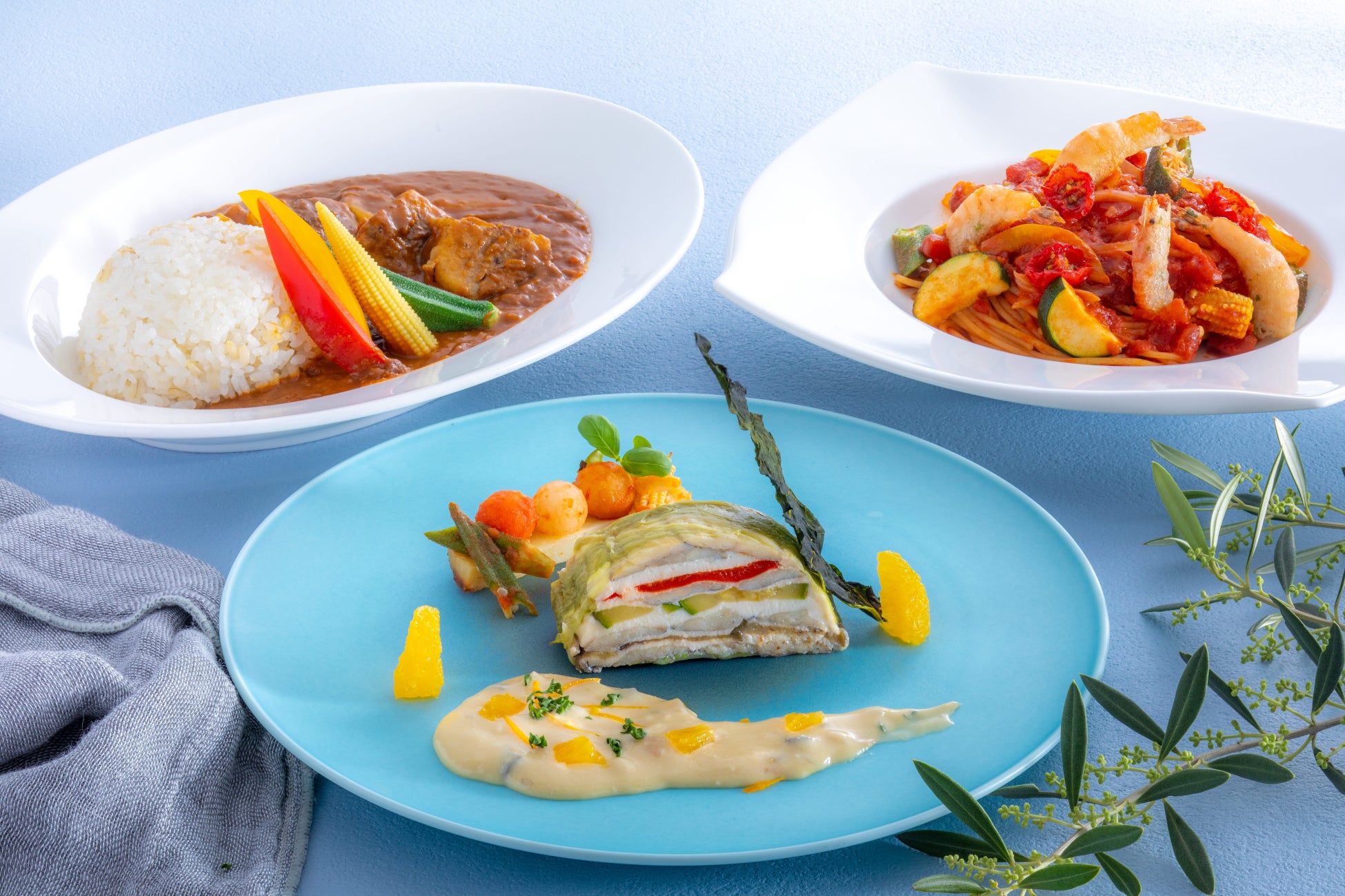 兵庫県食材を使った3 種のランチ。パスタランチは、旨みの強い川津海老をたっぷりの夏野菜とともにトマトスパゲティに。フィッシュランチは、太刀魚を見た目も美しいテリーヌ仕立てに。またカレーは、神戸ビーフの深い旨みをじっくりと堪能できます。スープ・サラダ・コーヒー・紅茶はブッフェスタイルで。