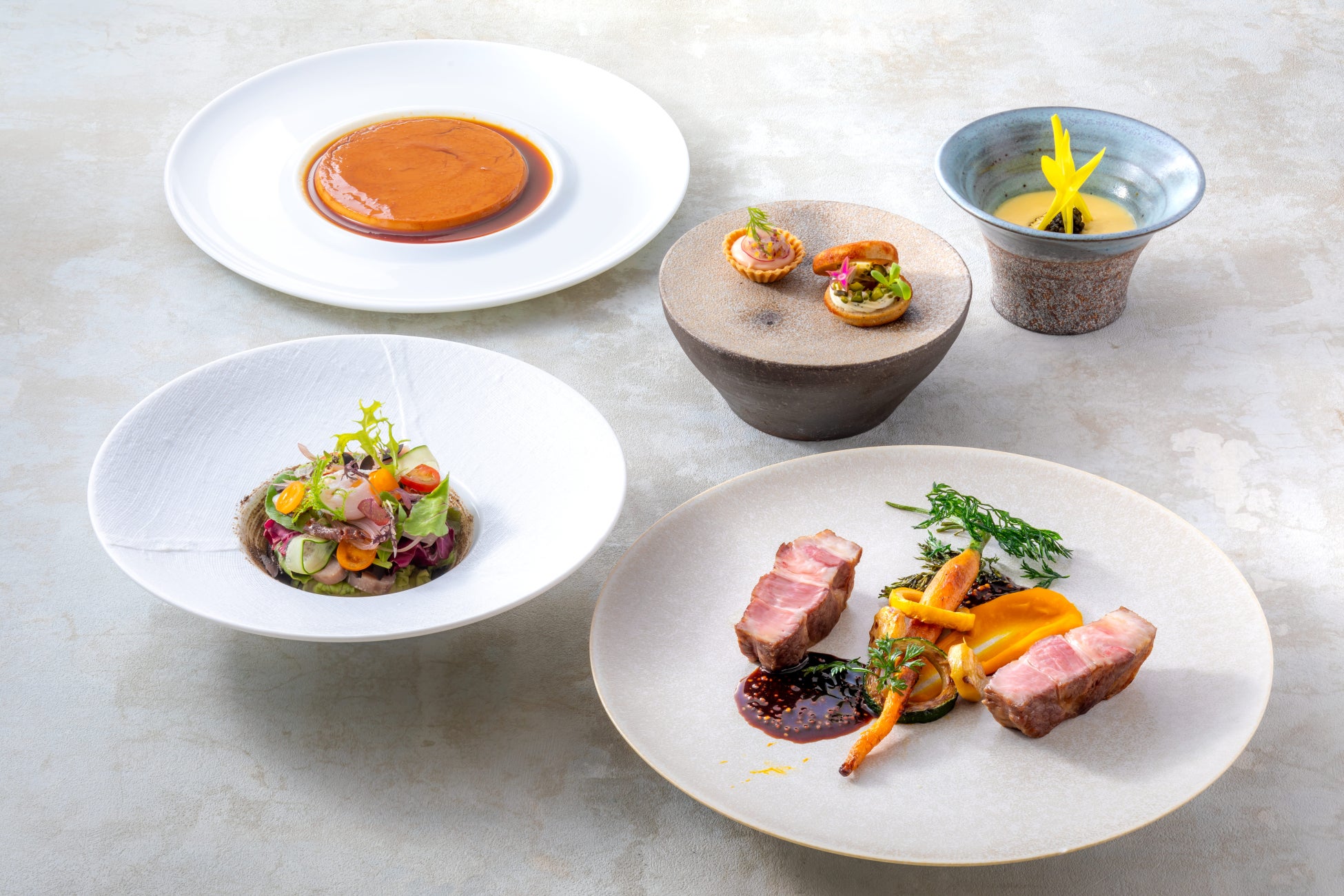新鮮で甘いトウモロコシは冷製クリームスープにしてキャビアを添え、ひょうご雪姫ポークは香ばしくグリエし、神戸ワインマスタードソースを合わせるなど、厳選した兵庫食材を美しいフレンチのコースに。オレンジ色の黄味が特徴の“ 高砂の夕日”卵を使用した大人風味のキャラメルプディングにもご期待ください。