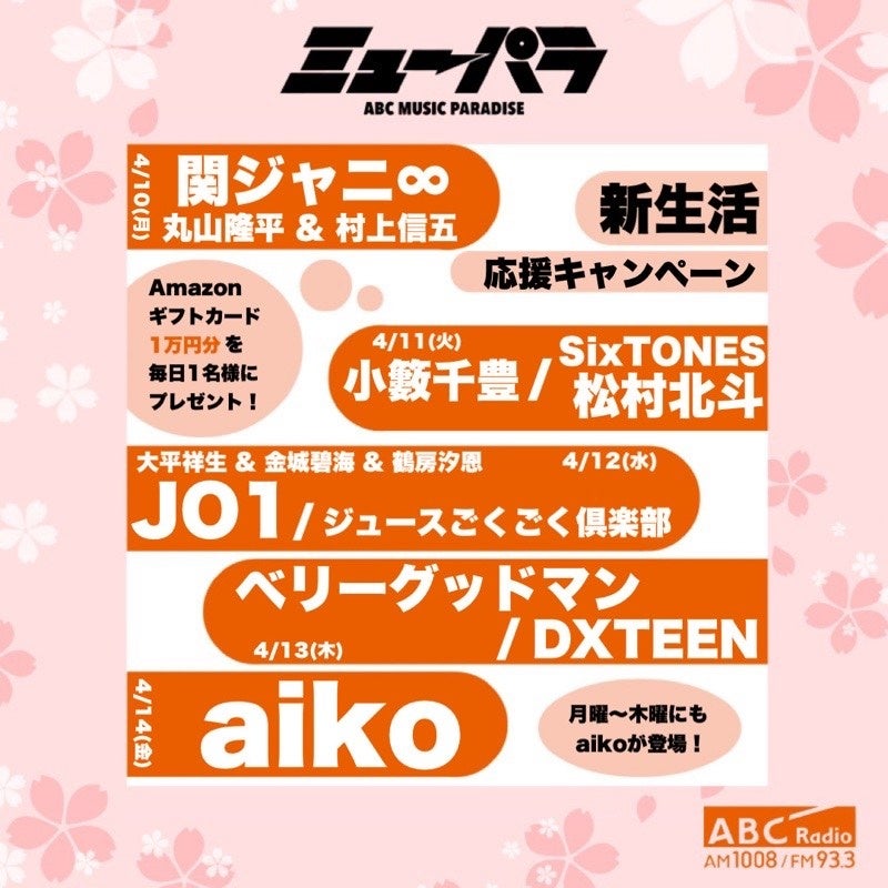 4月10日(月)~14日(金)、ABCミュージックパラダイスが『新生活応援キャンペーン』を実施!ギフトカード1万円毎日プレゼント!豪華ゲストも!